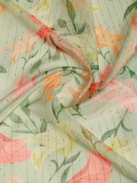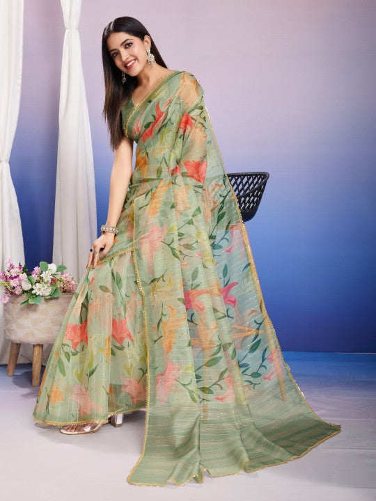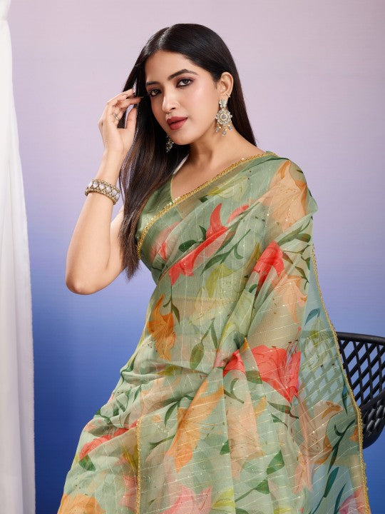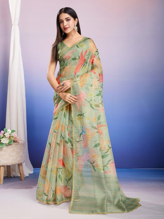 Floral Print::Printed Bollywood Organza (Green)