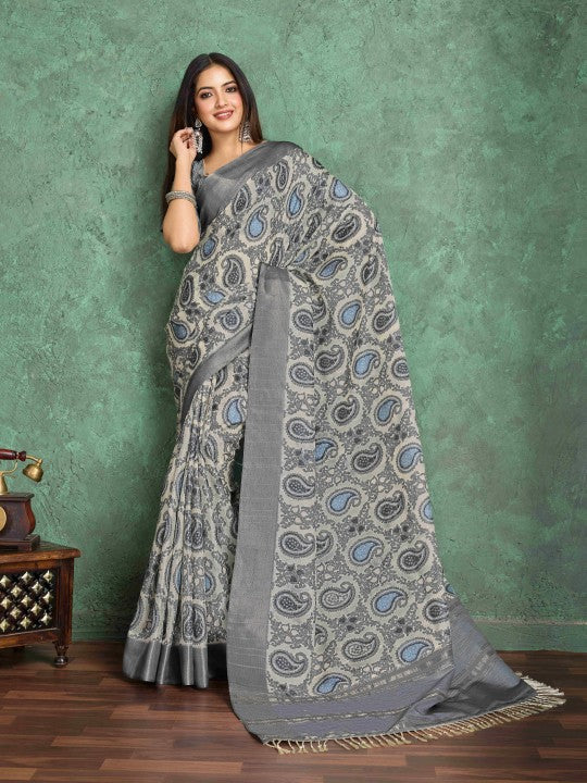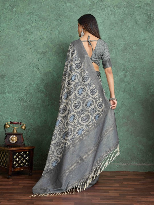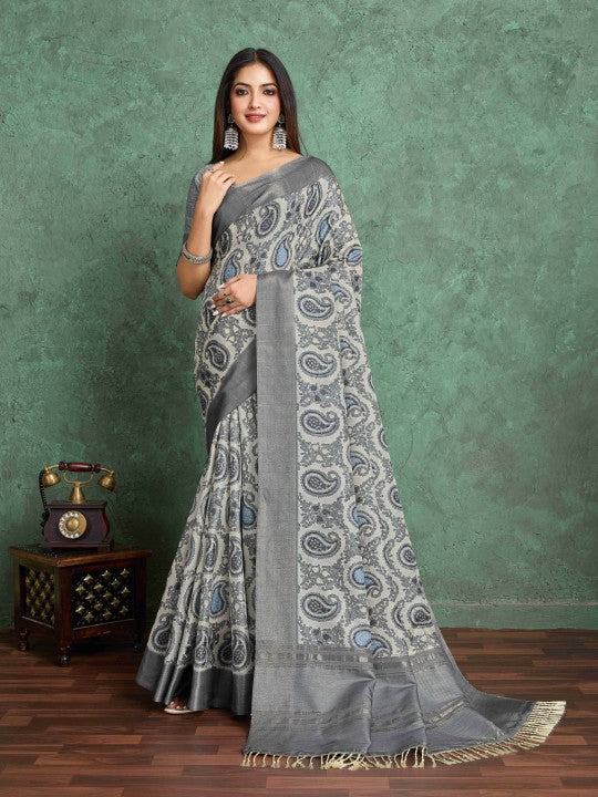 Printed::Paisley Bollywood Pure Silk Saree (Silver)