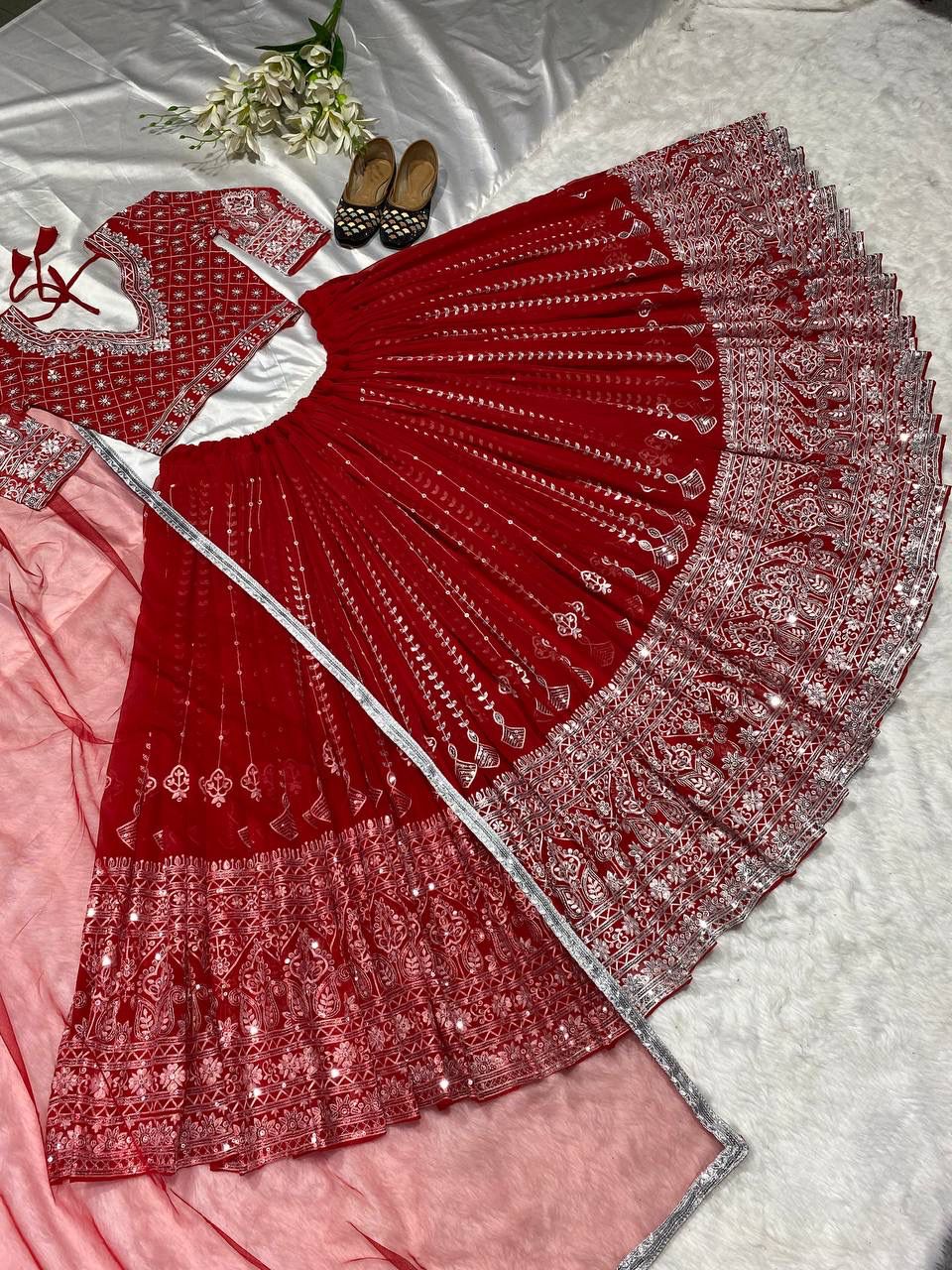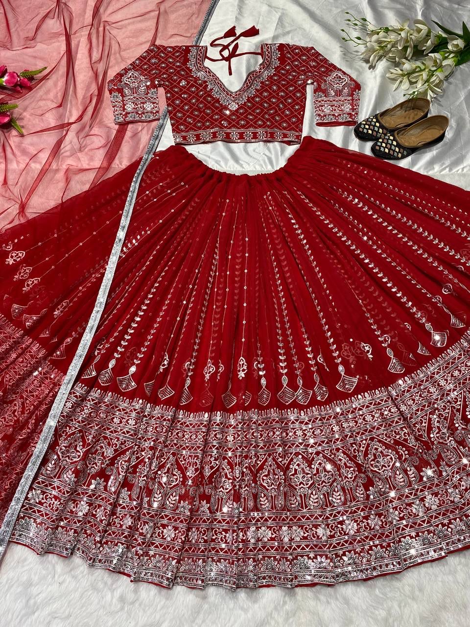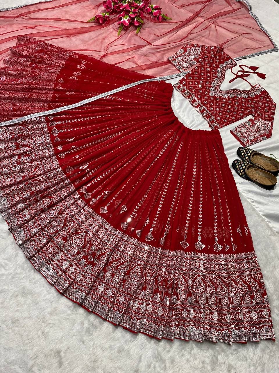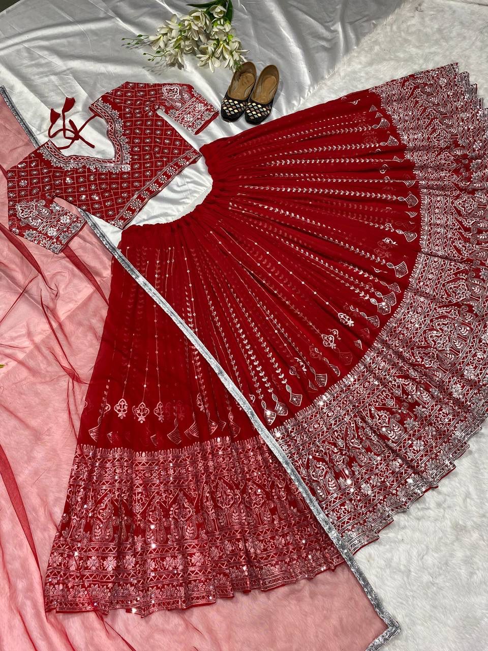 Fabric :- Faux Georgette Lehenga Length:- 42" Inches (106.68 CM) Width-up To 44 to 46" (111.76 CM TO 116.84 CM) |