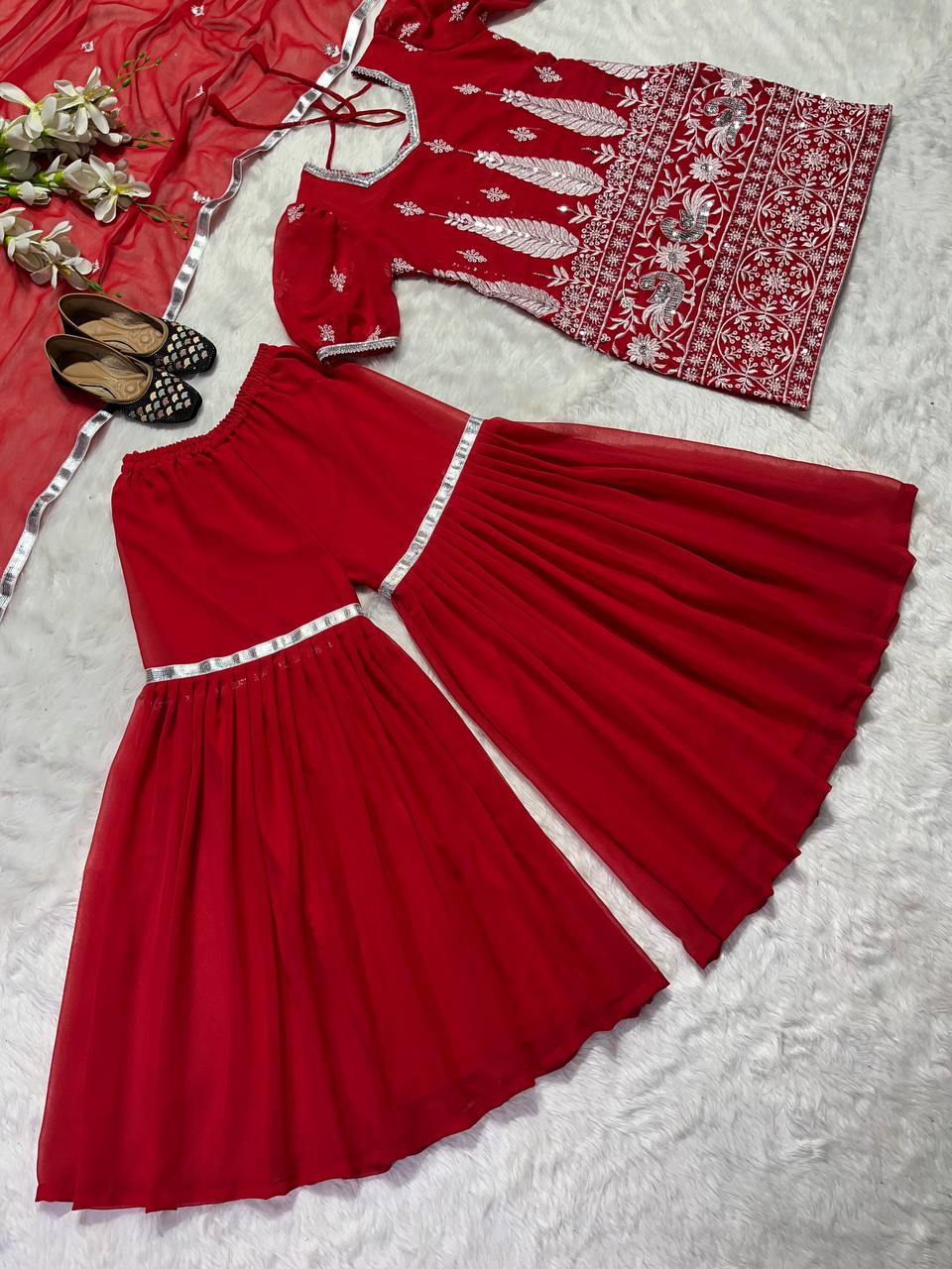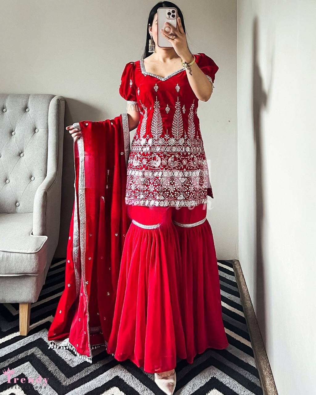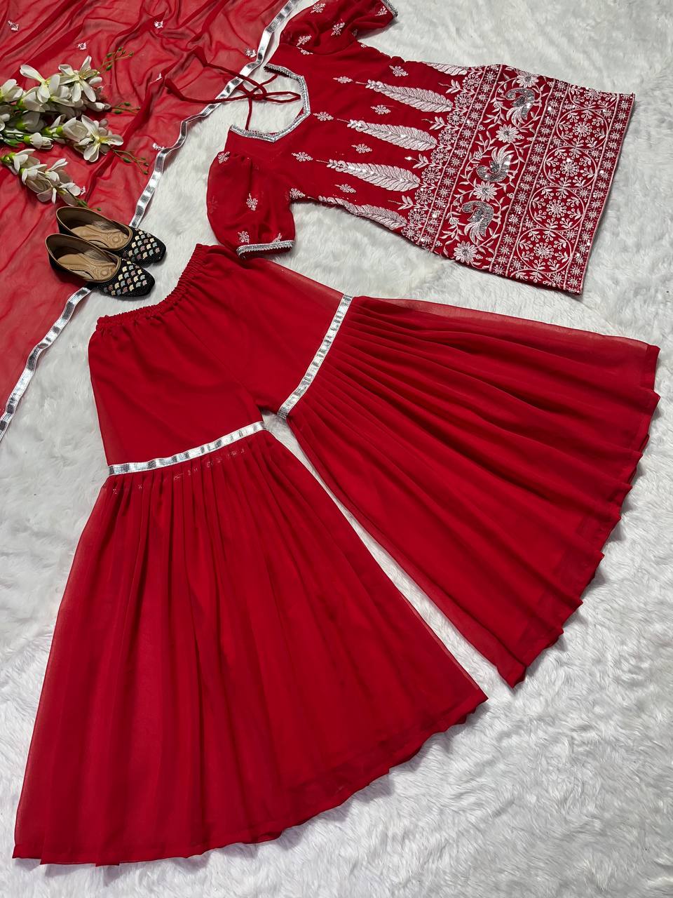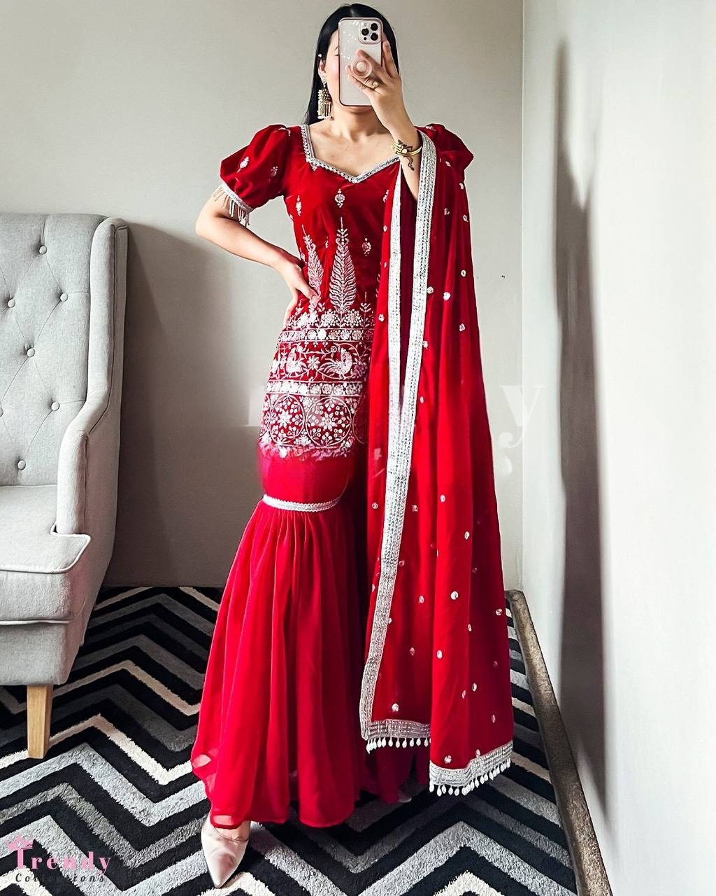 | SUIT | Cherry red sequence embroidery work sharara Plazo designer suit |