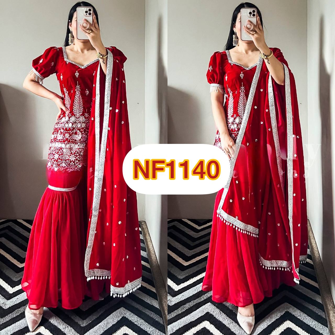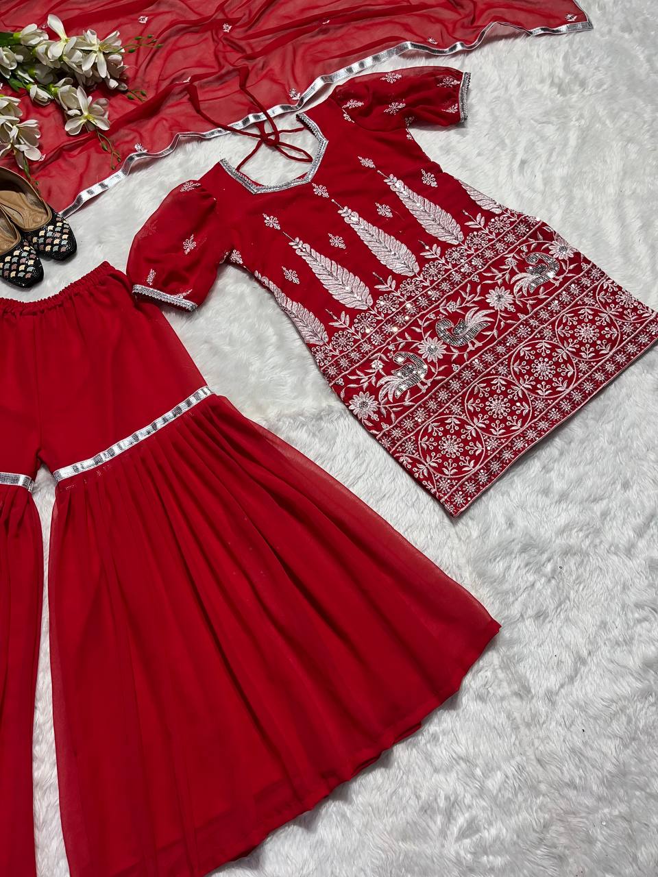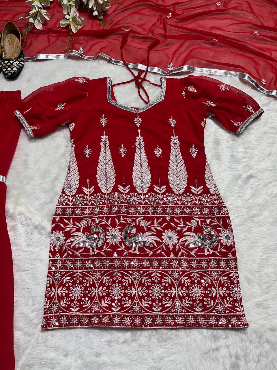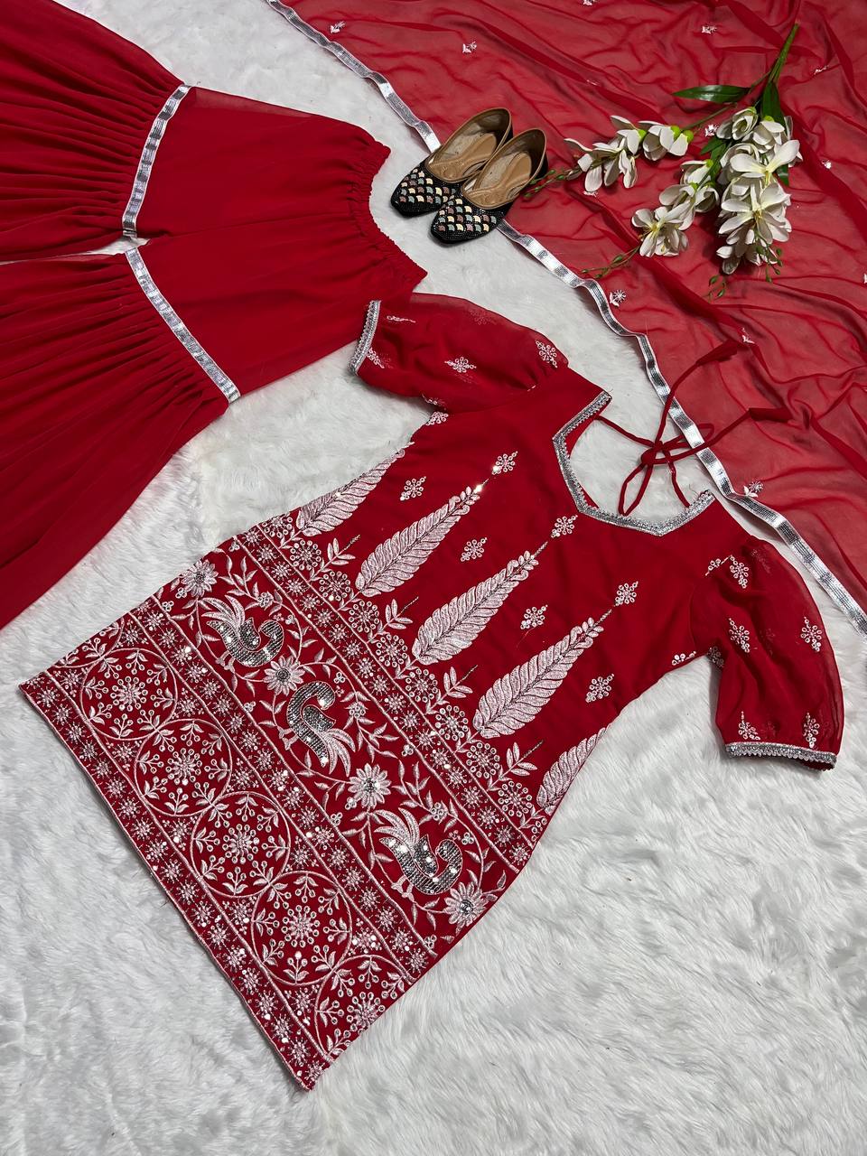 | SUIT | Cherry red sequence embroidery work sharara Plazo designer suit |