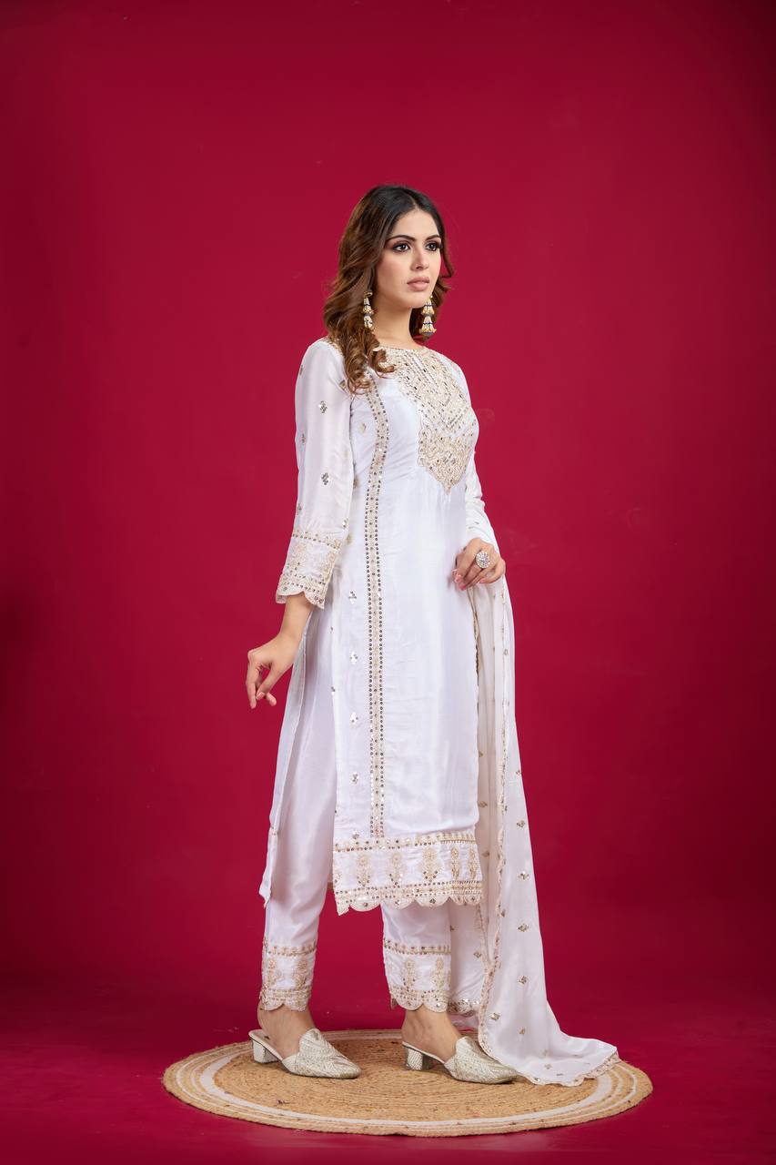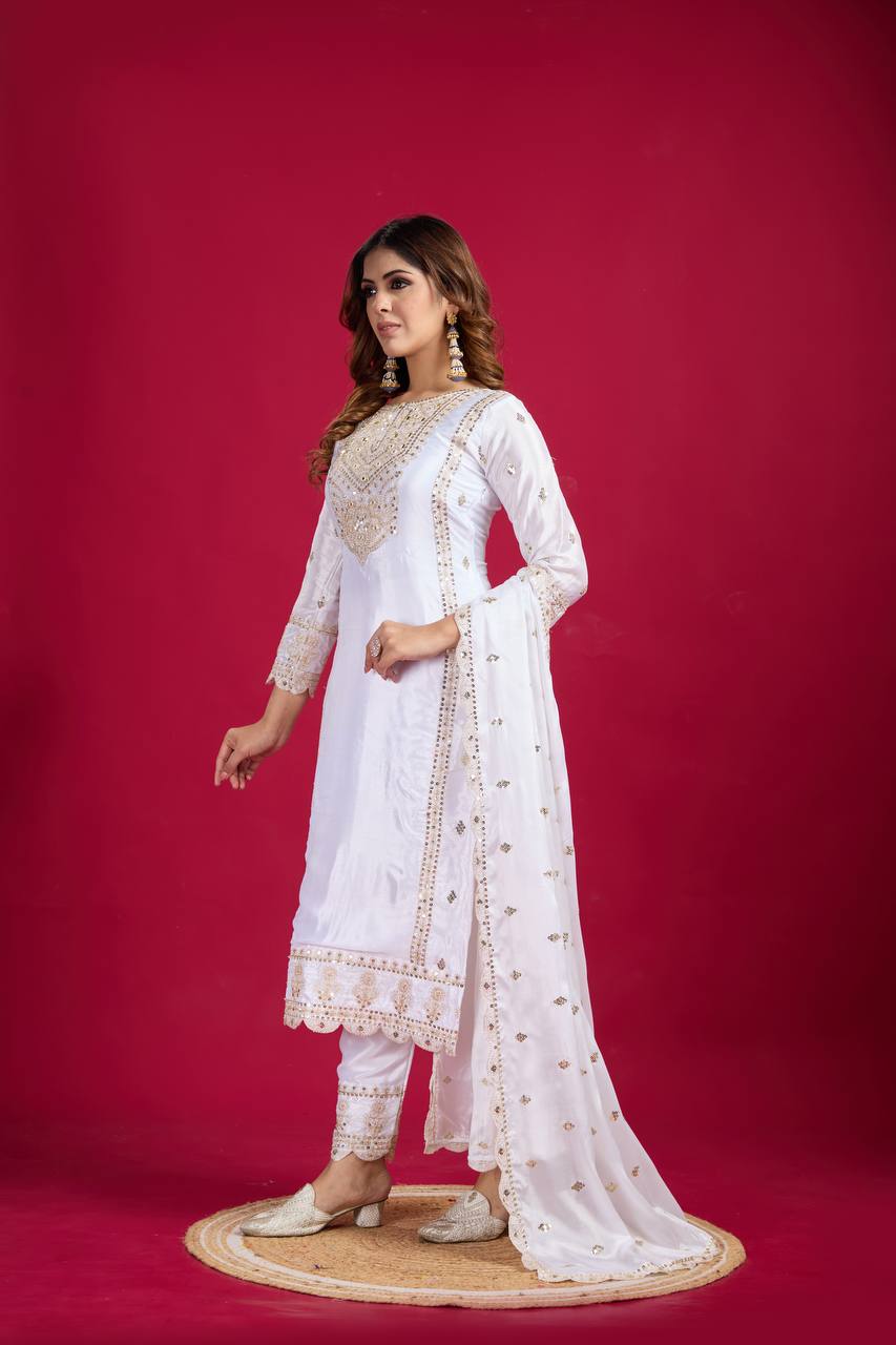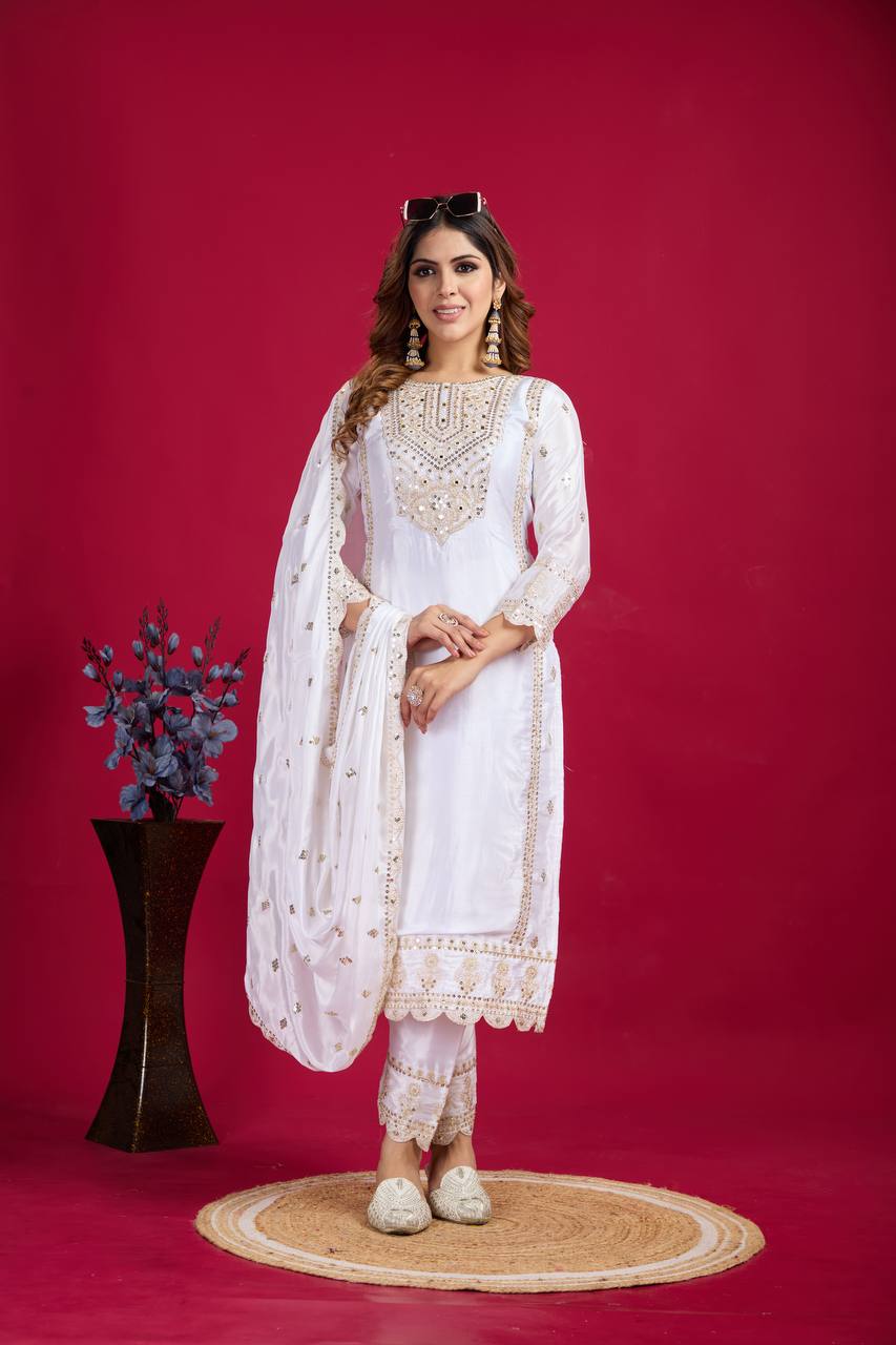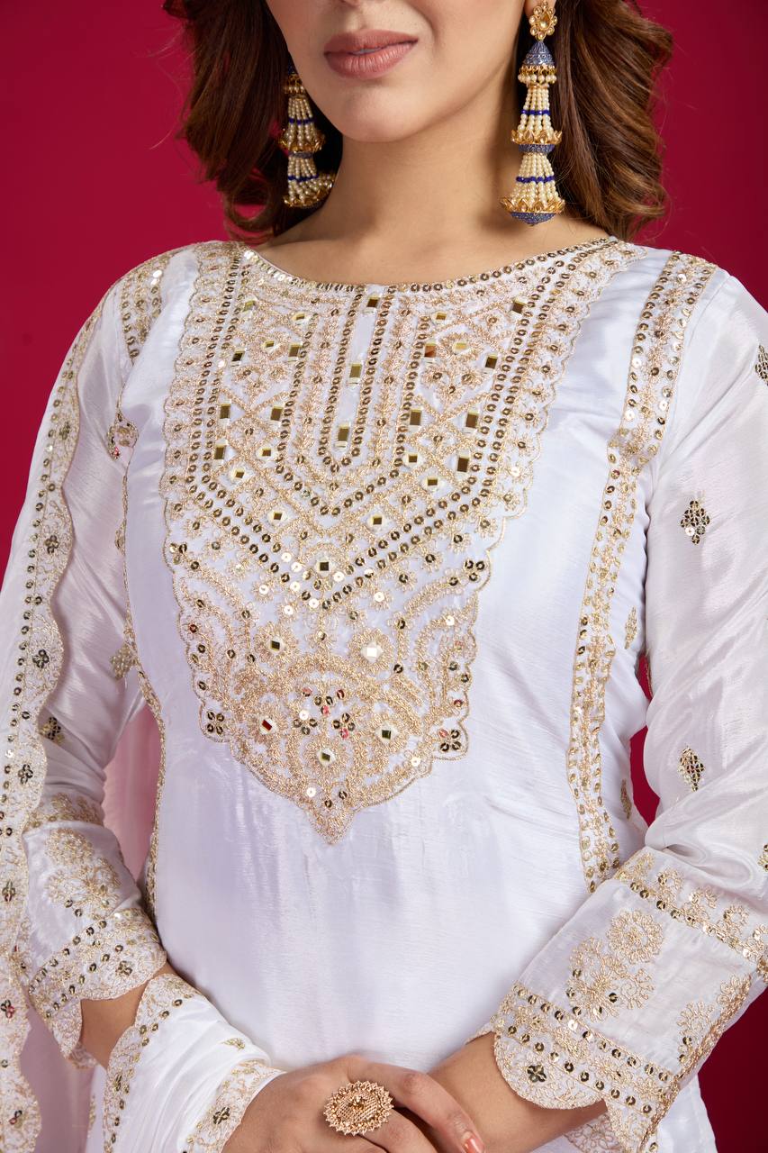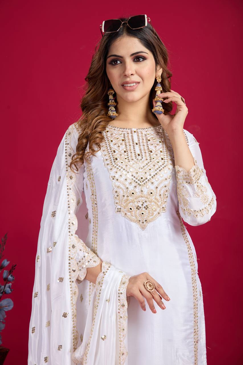 • Chinon Silk White Colour Sequence Work Fully Stitched Designer Suit