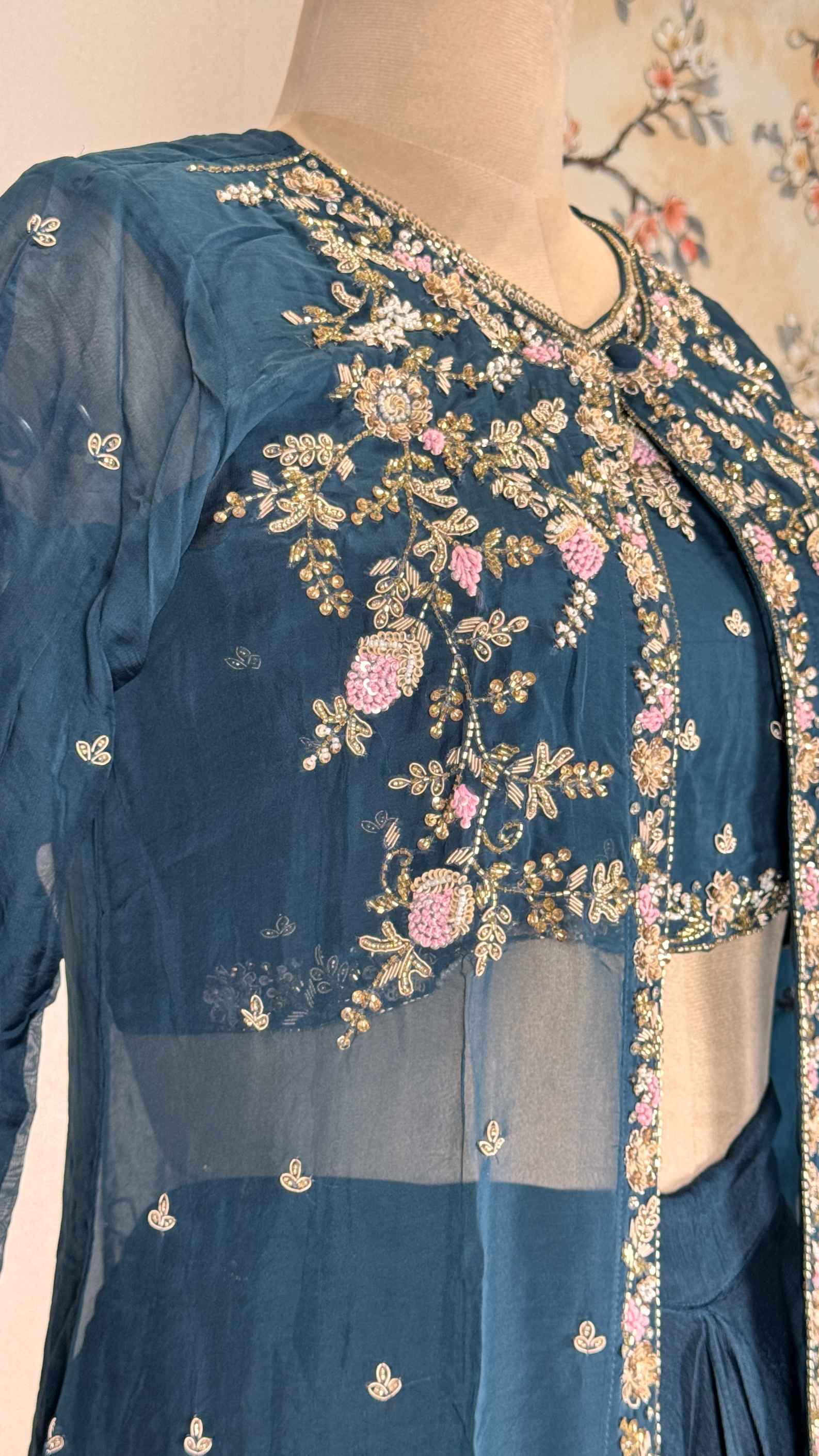 - Jacket Work:- Beautiful handcrafted Cutdana beats and zardosi thread Work
