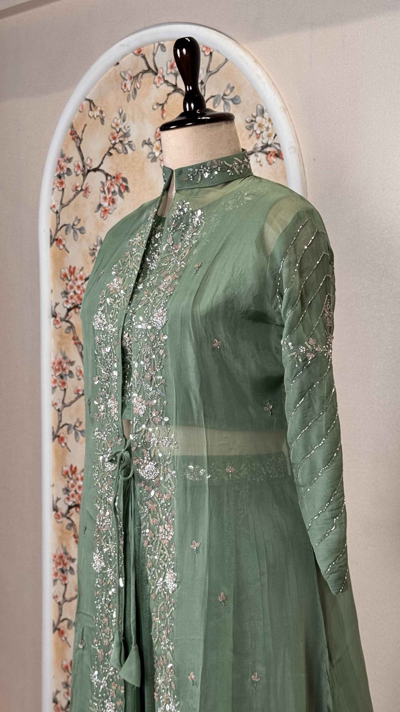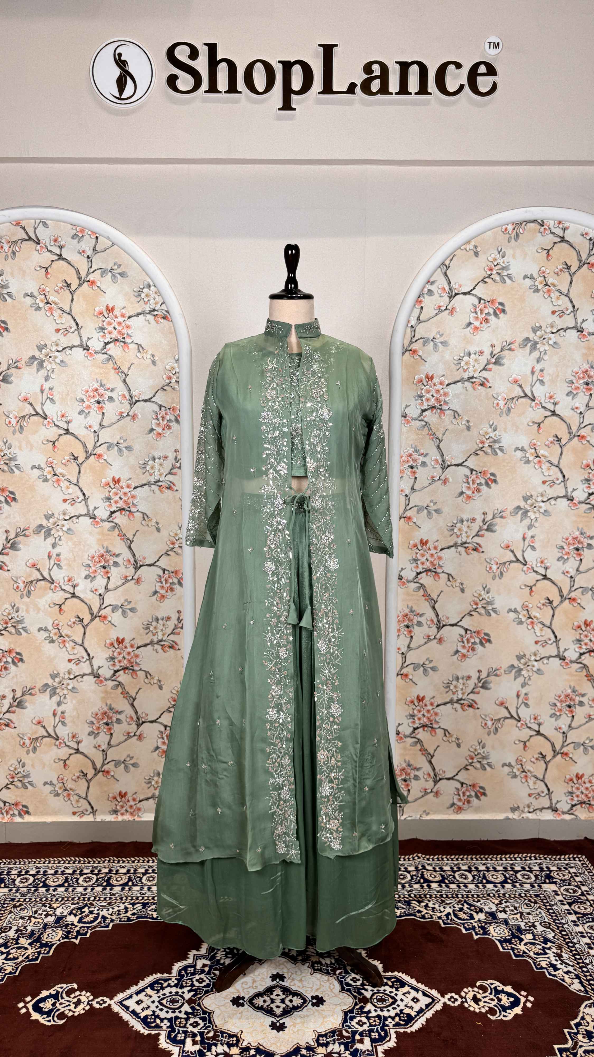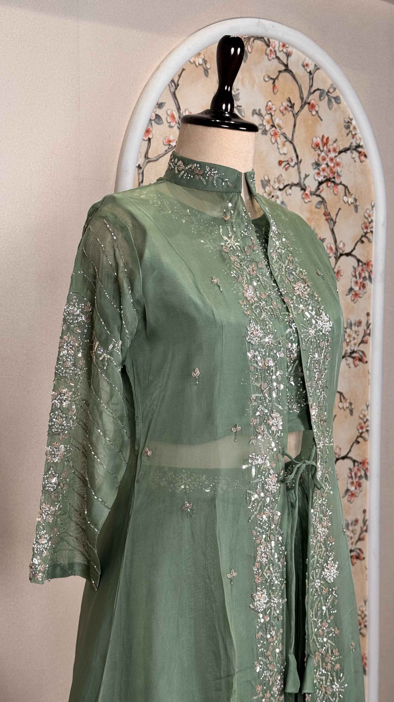 - Jacket Work: Complete borderline Beautiful handcrafted Cutdana beats Work