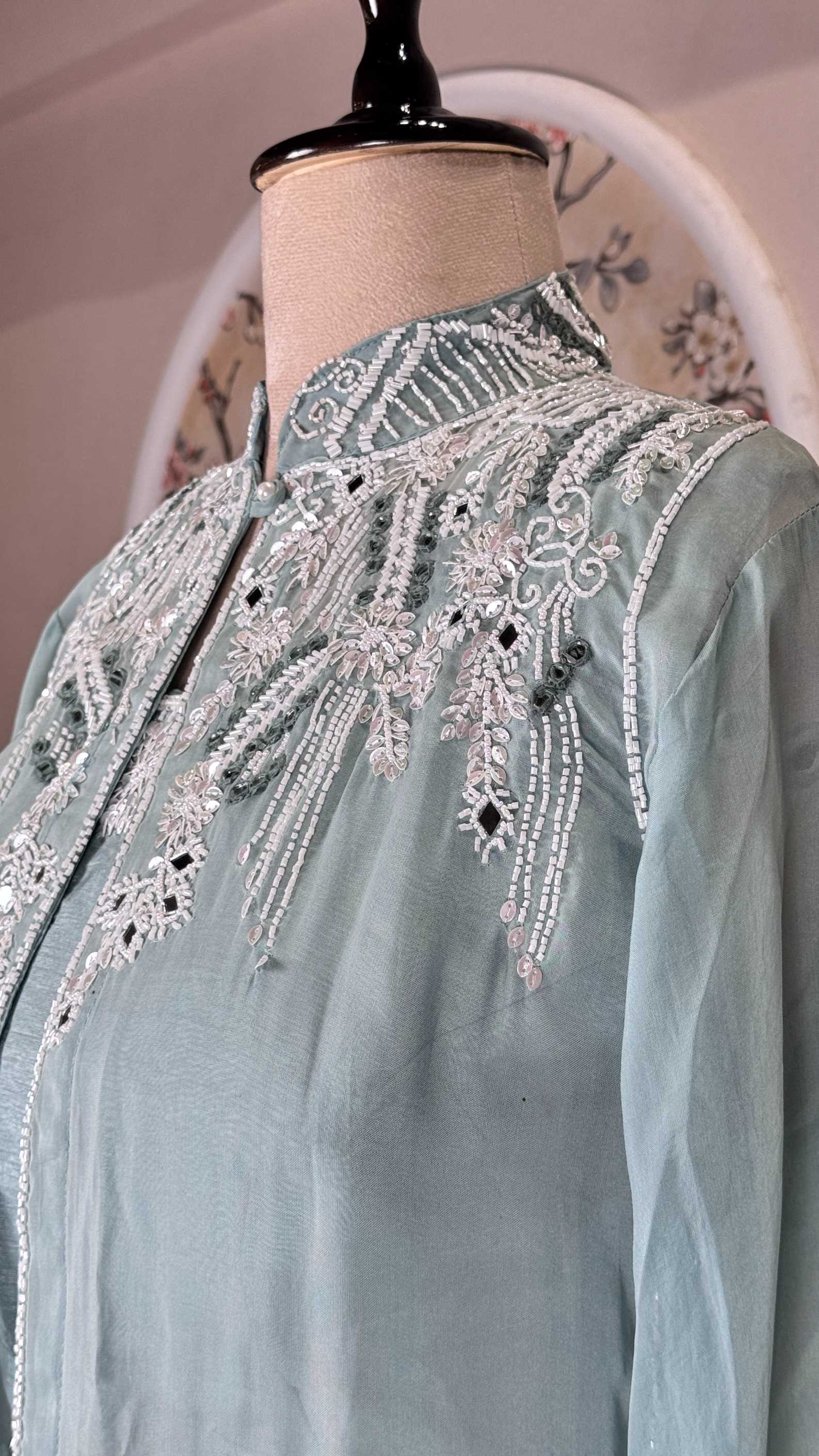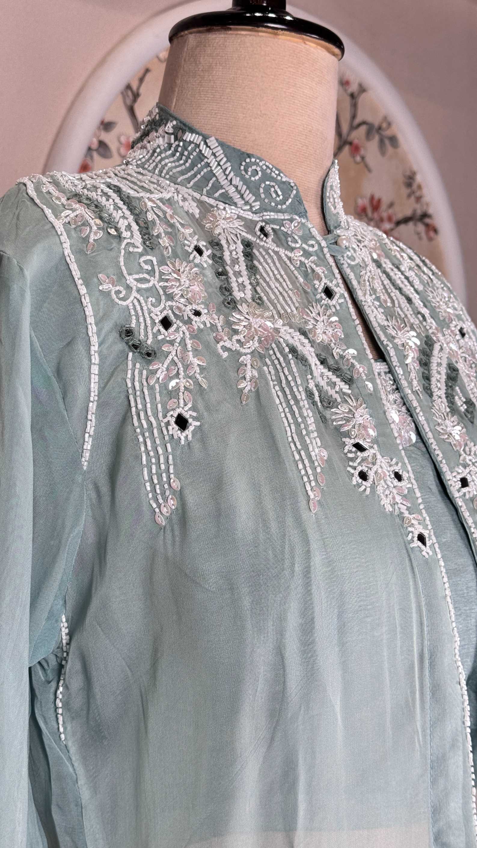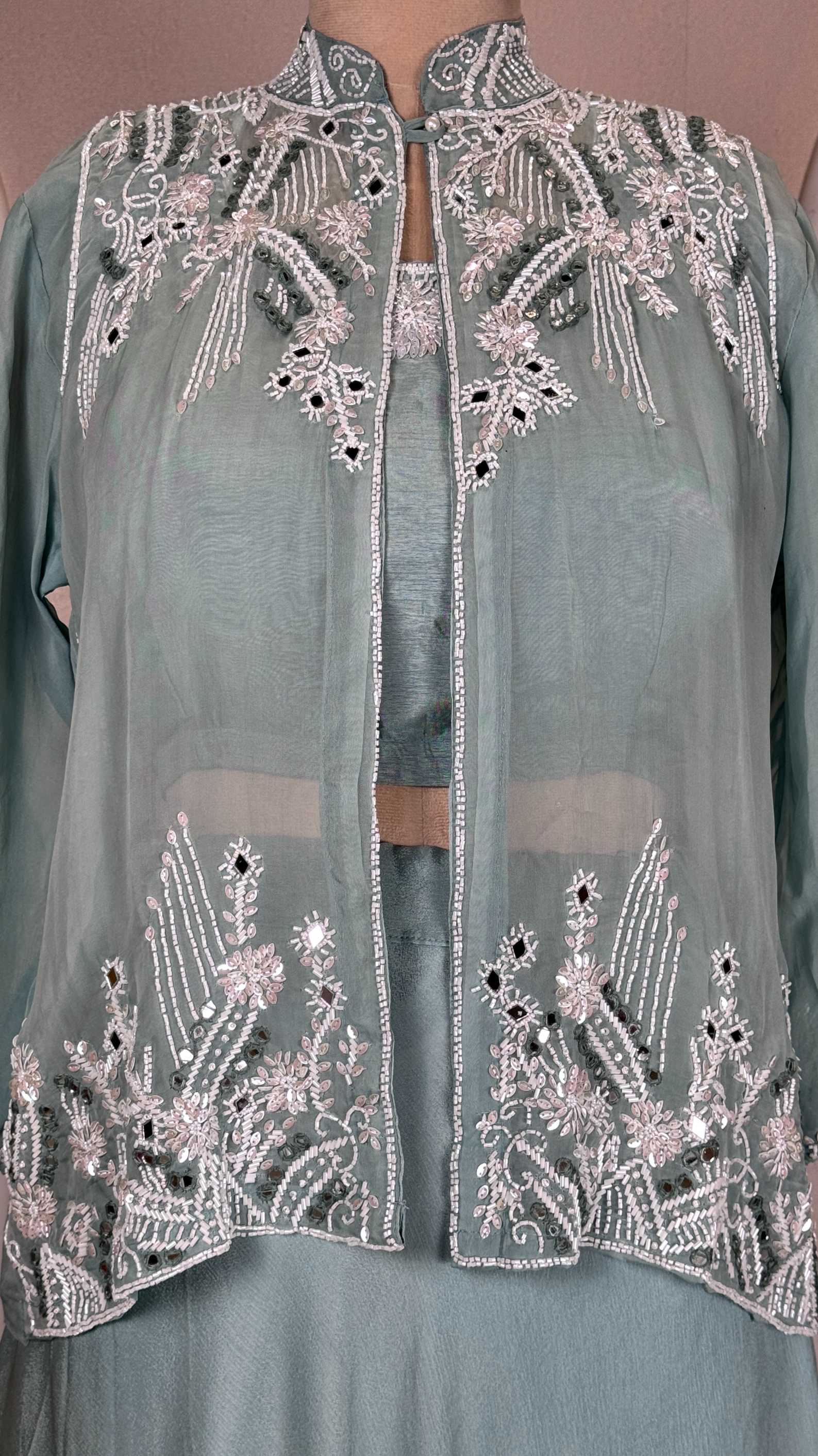 - Jacket Work: Beautiful handcrafted Cutdana beats and floral Work