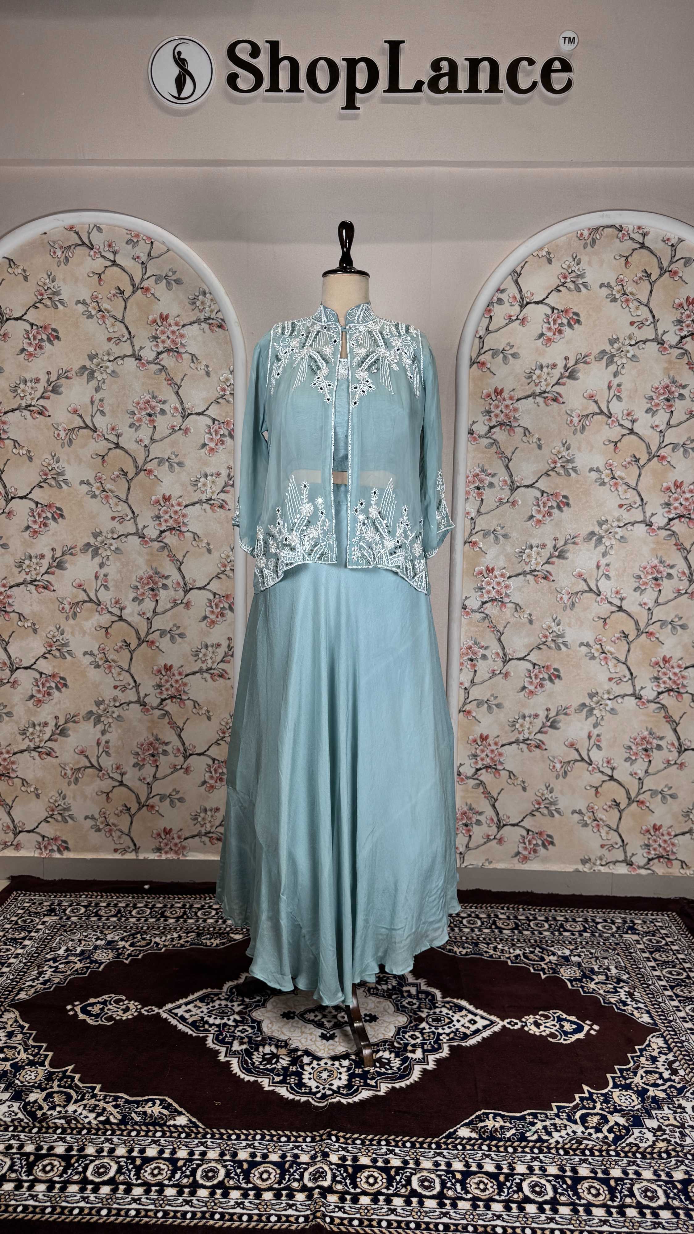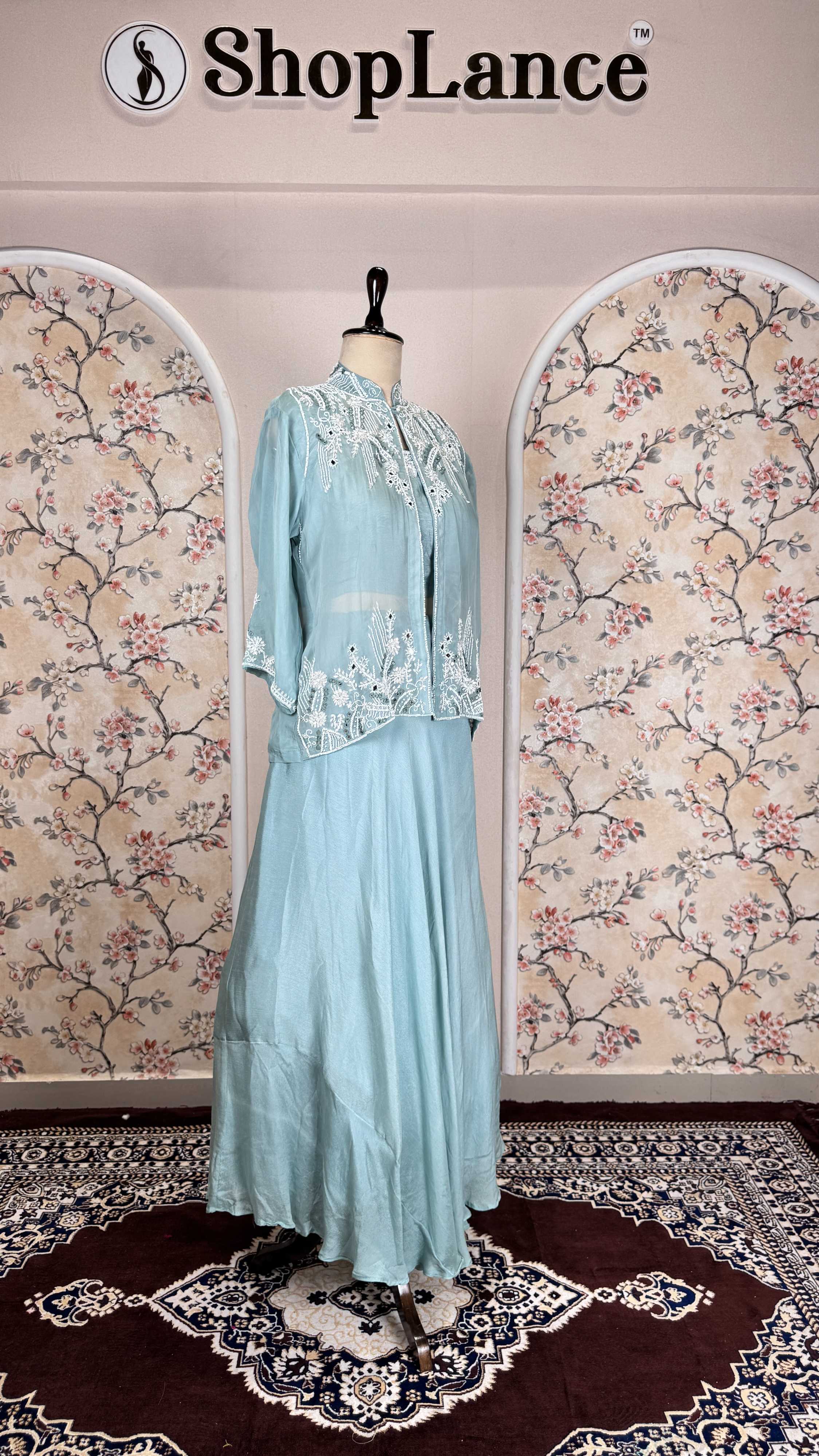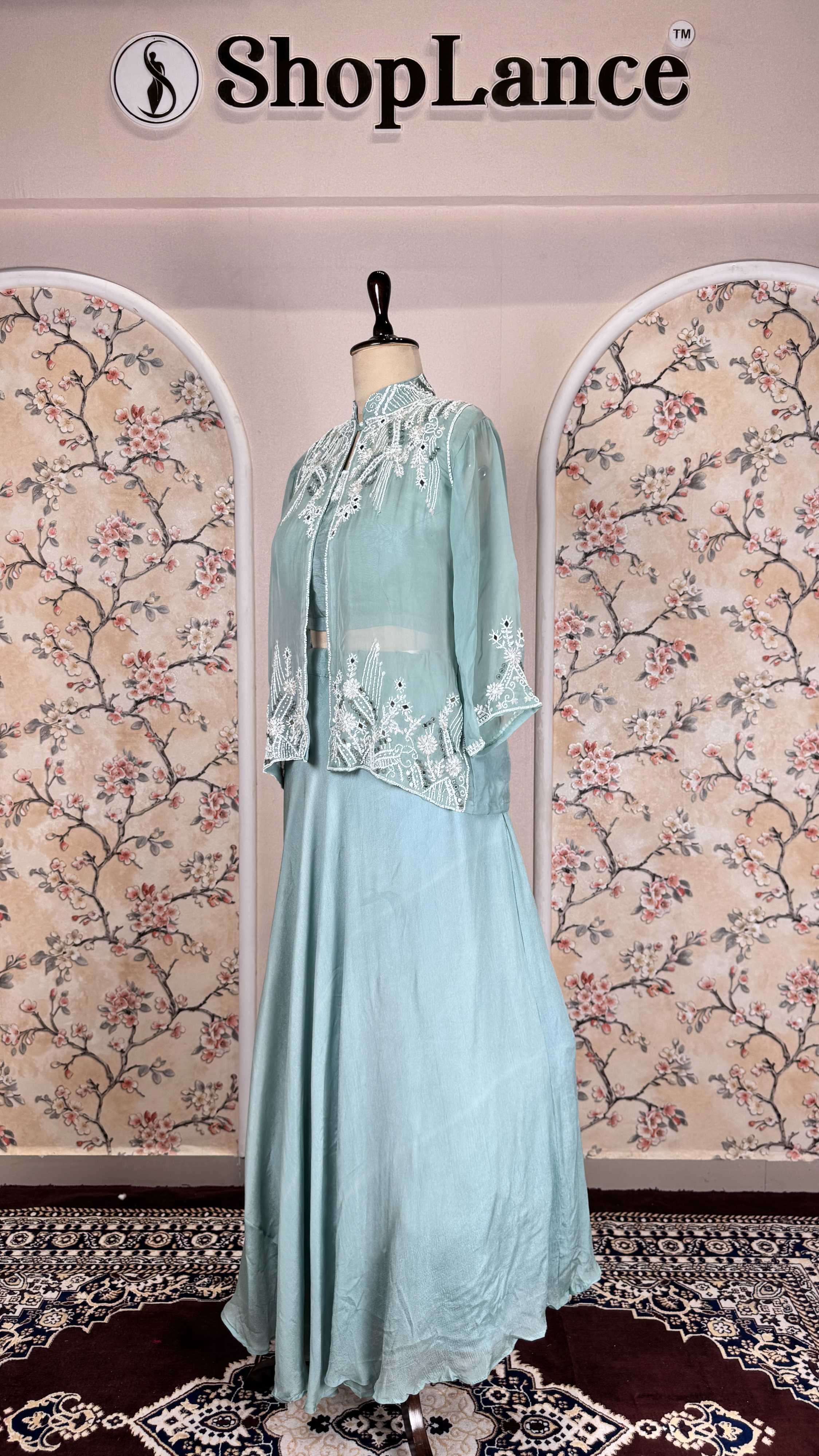 - Jacket Work: Beautiful handcrafted Cutdana beats and floral Work
