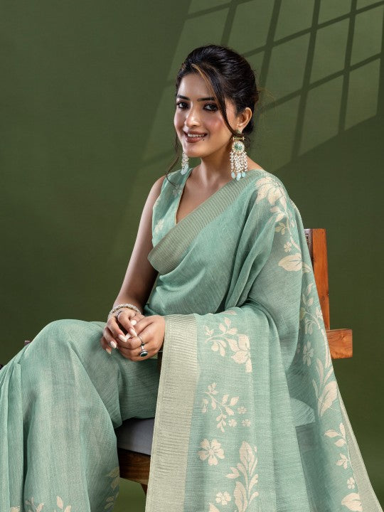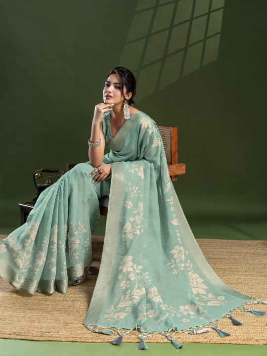 • Woven::Floral Print Bollywood Tissue Saree (Green)