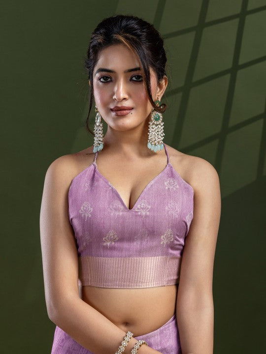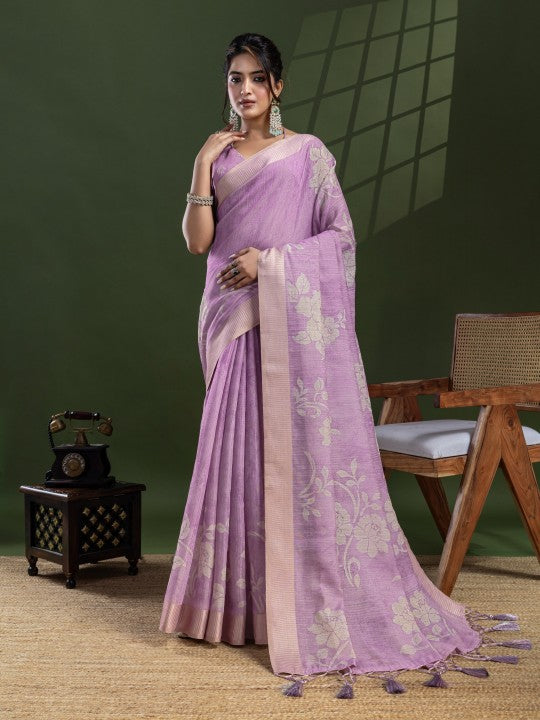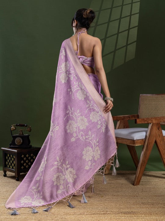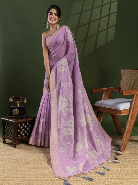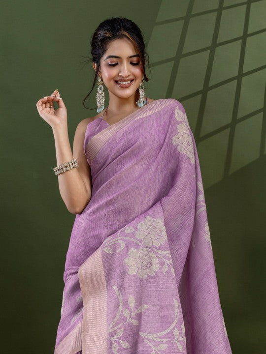 • Floral Print::Printed Bollywood Tissue Saree (Purple)