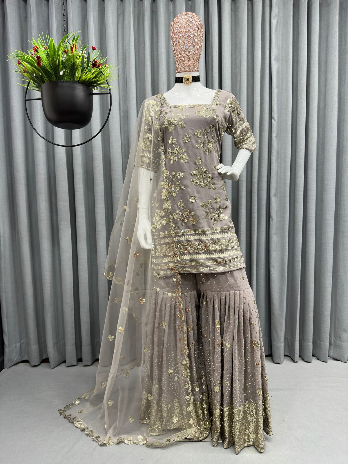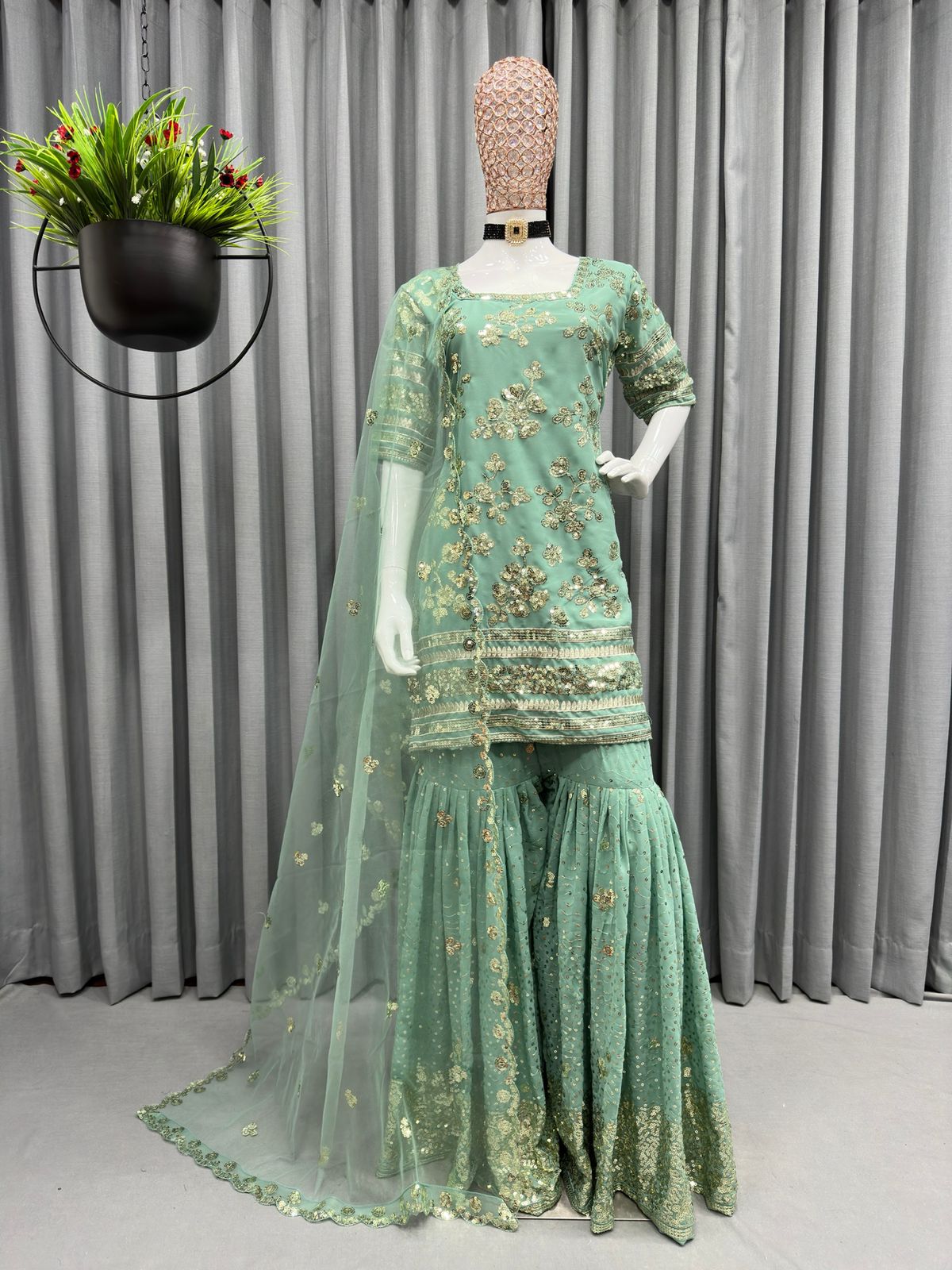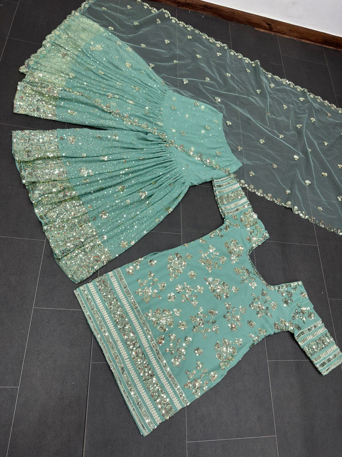 | Sharara | Fabric. :-Georgette with inner Work :- Thread with Sequce work Size. :- Free (Full stitched with elastic)