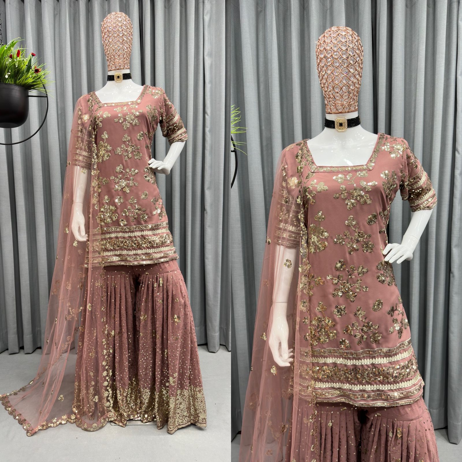 | TOP | Fabric. :- Faux Georgette with inner Work :-Thread with Sequce work Size :-up to 42 (Full-Stitched) Weight. :-0.900 Grm Colour. :- 6 |
