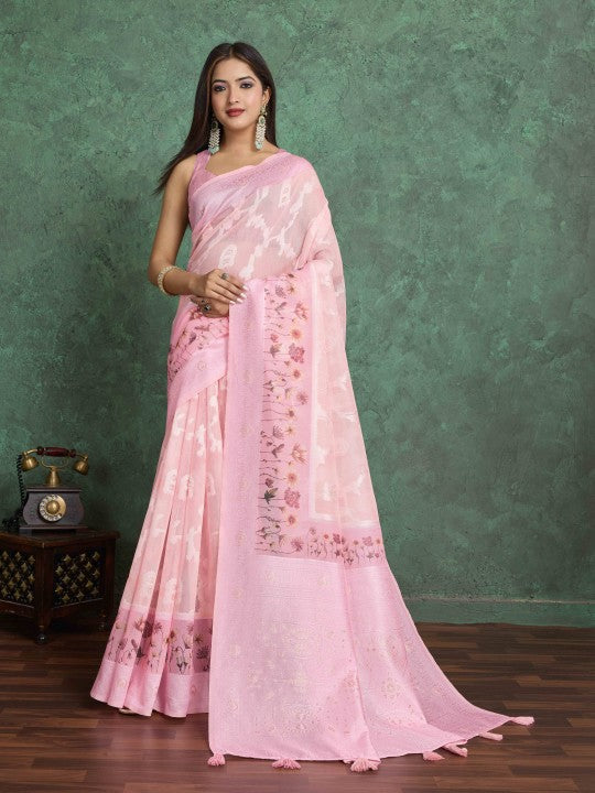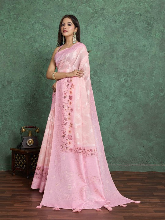 Woven::Floral Print Bollywood Pure Cotton Saree (Pink)
