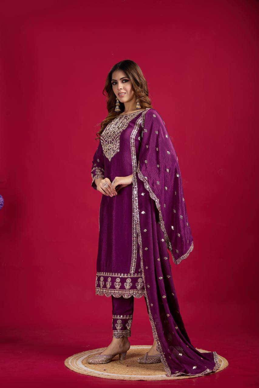• Pure Chinon Silk With Real Mirror Embroidery Work Designer Suit