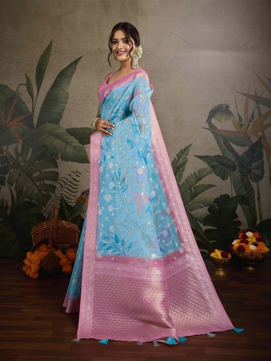 Floral Print::Printed Banarasi Pure Cotton Saree (Blue)