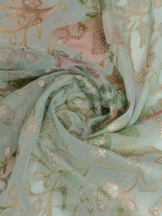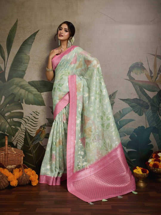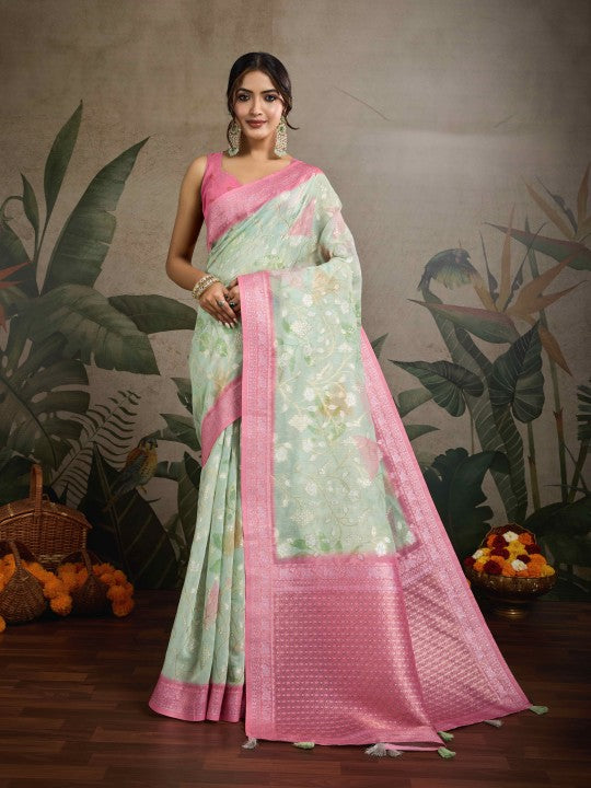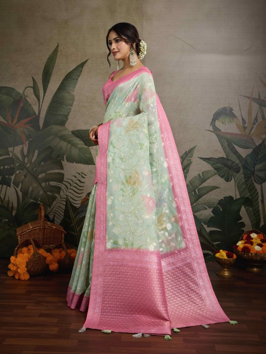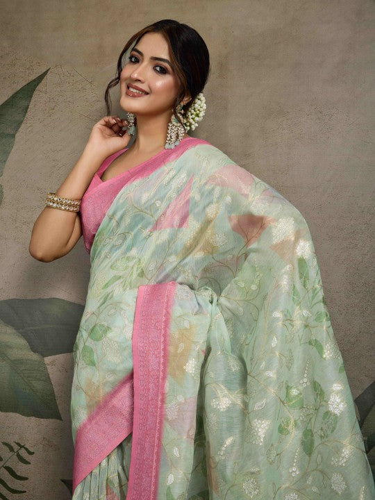 Floral Print::Printed Banarasi Pure Cotton Saree (Green)