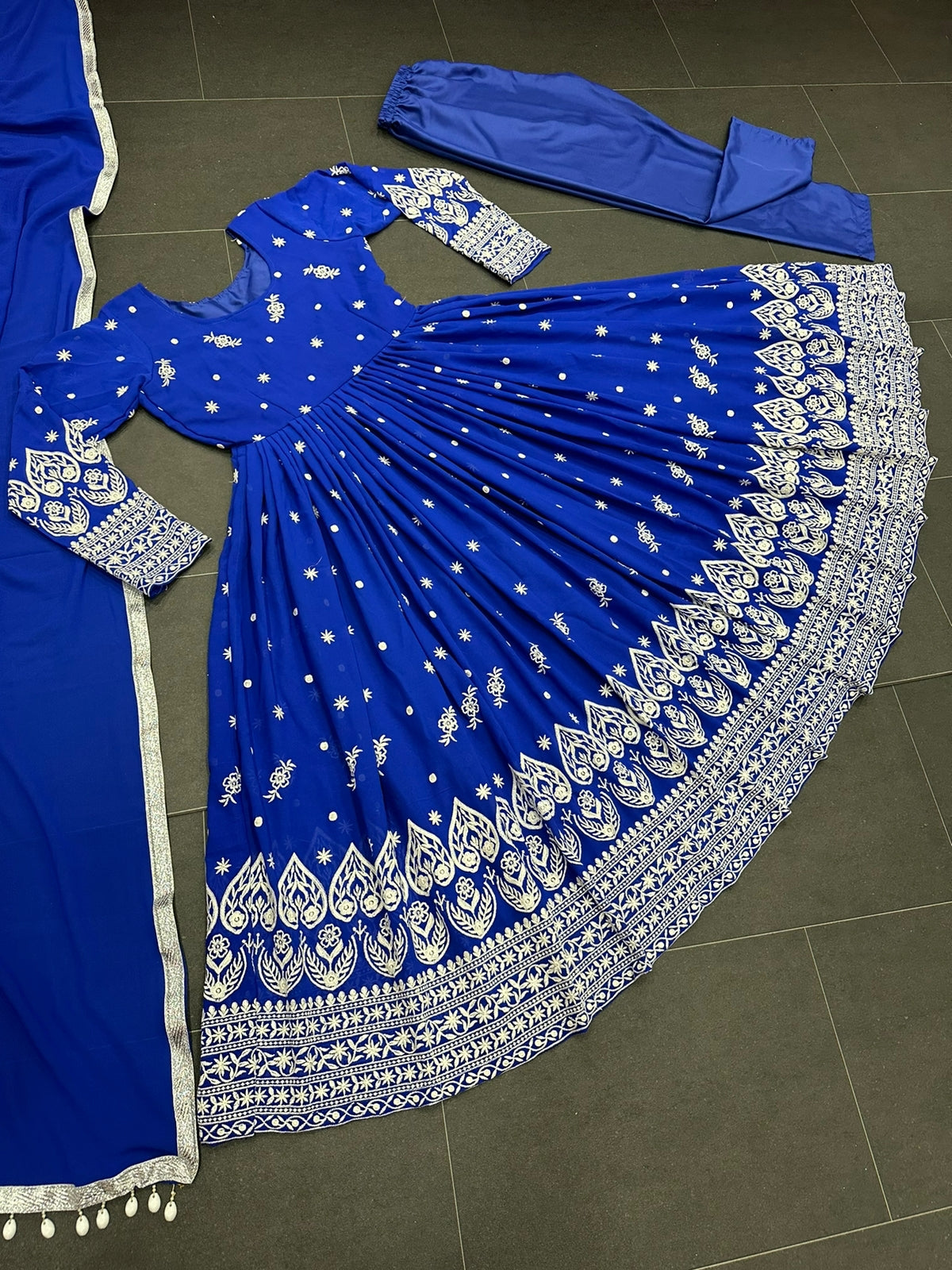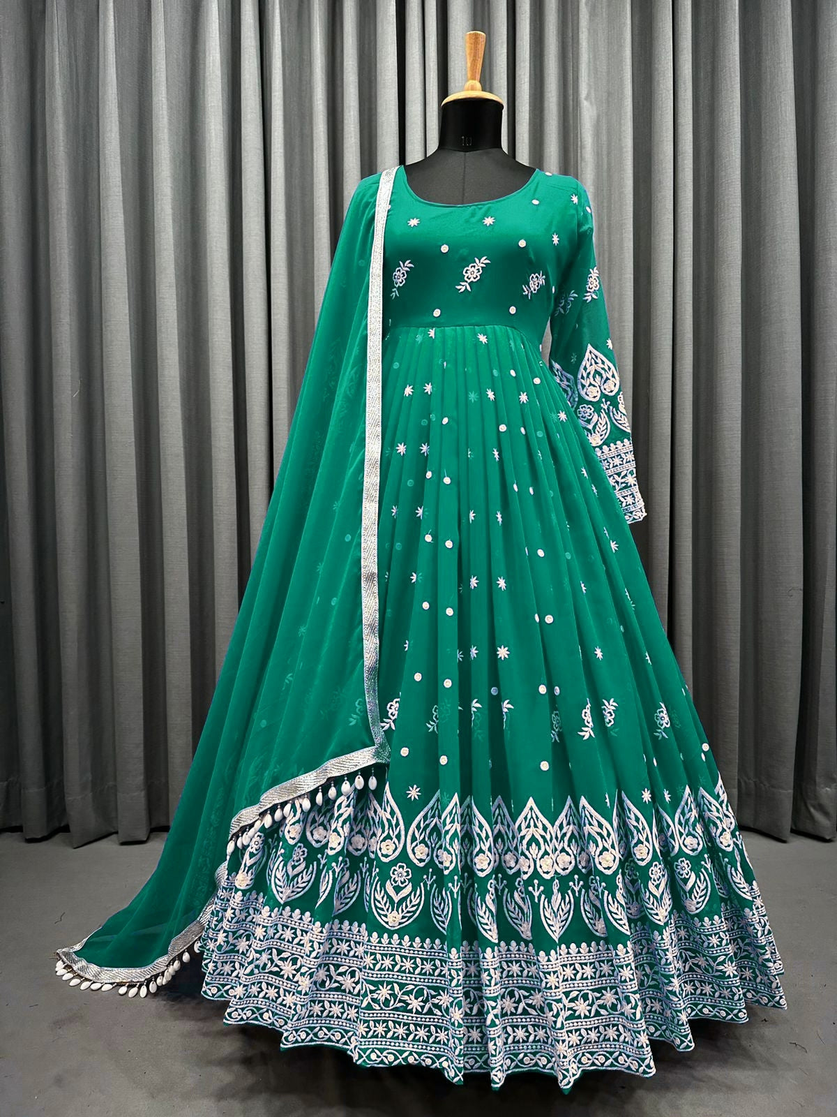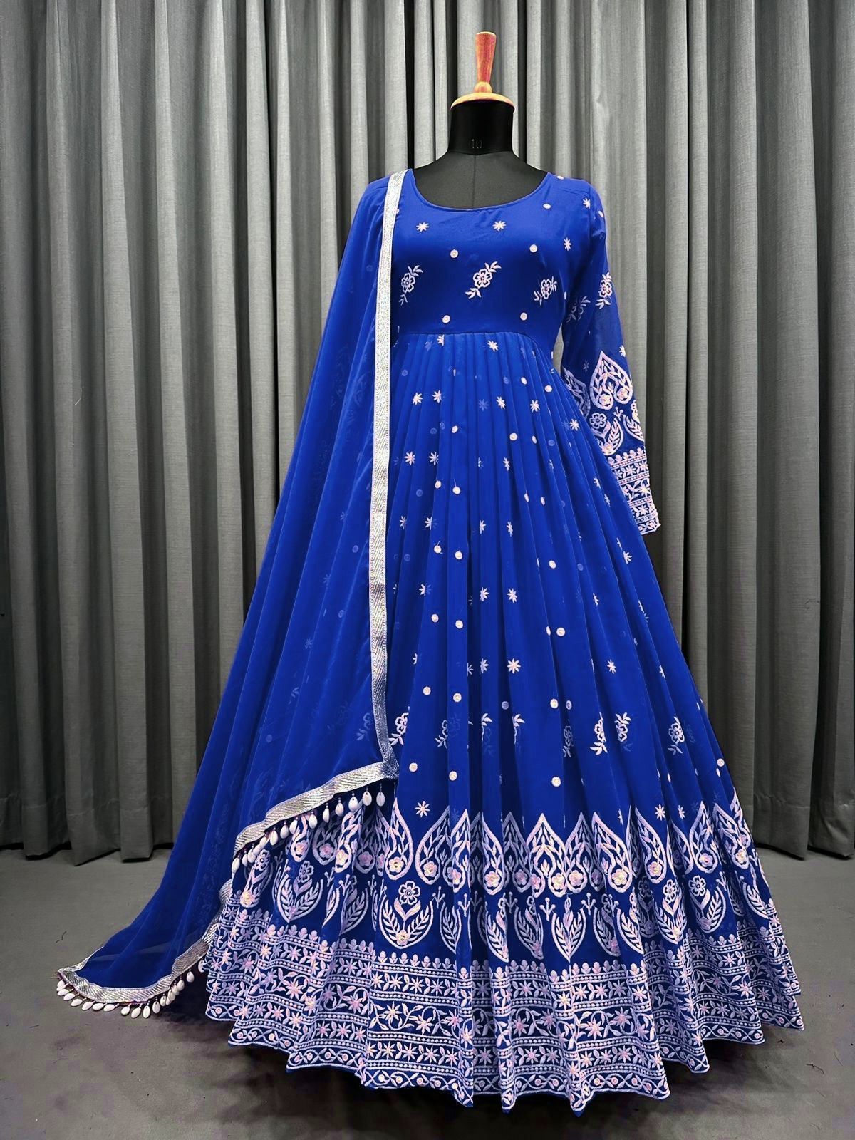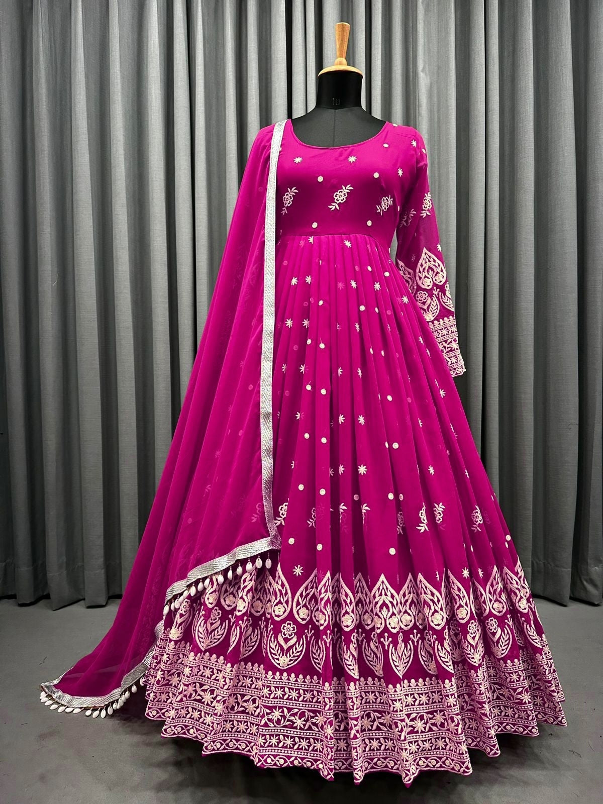 | Gown | Stylish faux georgette embroidered designer suit Attractive Party Wear Maslin Top Bottom has a Regular-fit and is Made From High-Grade Fabrics And Yarn. |