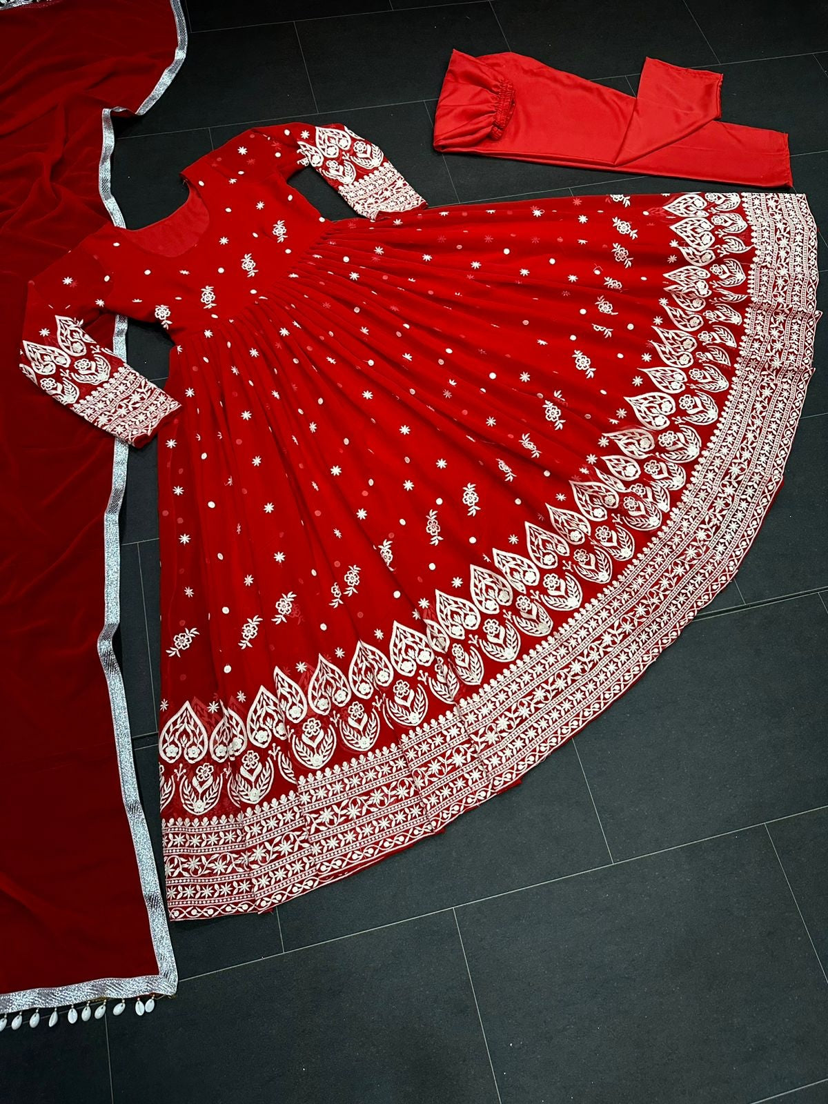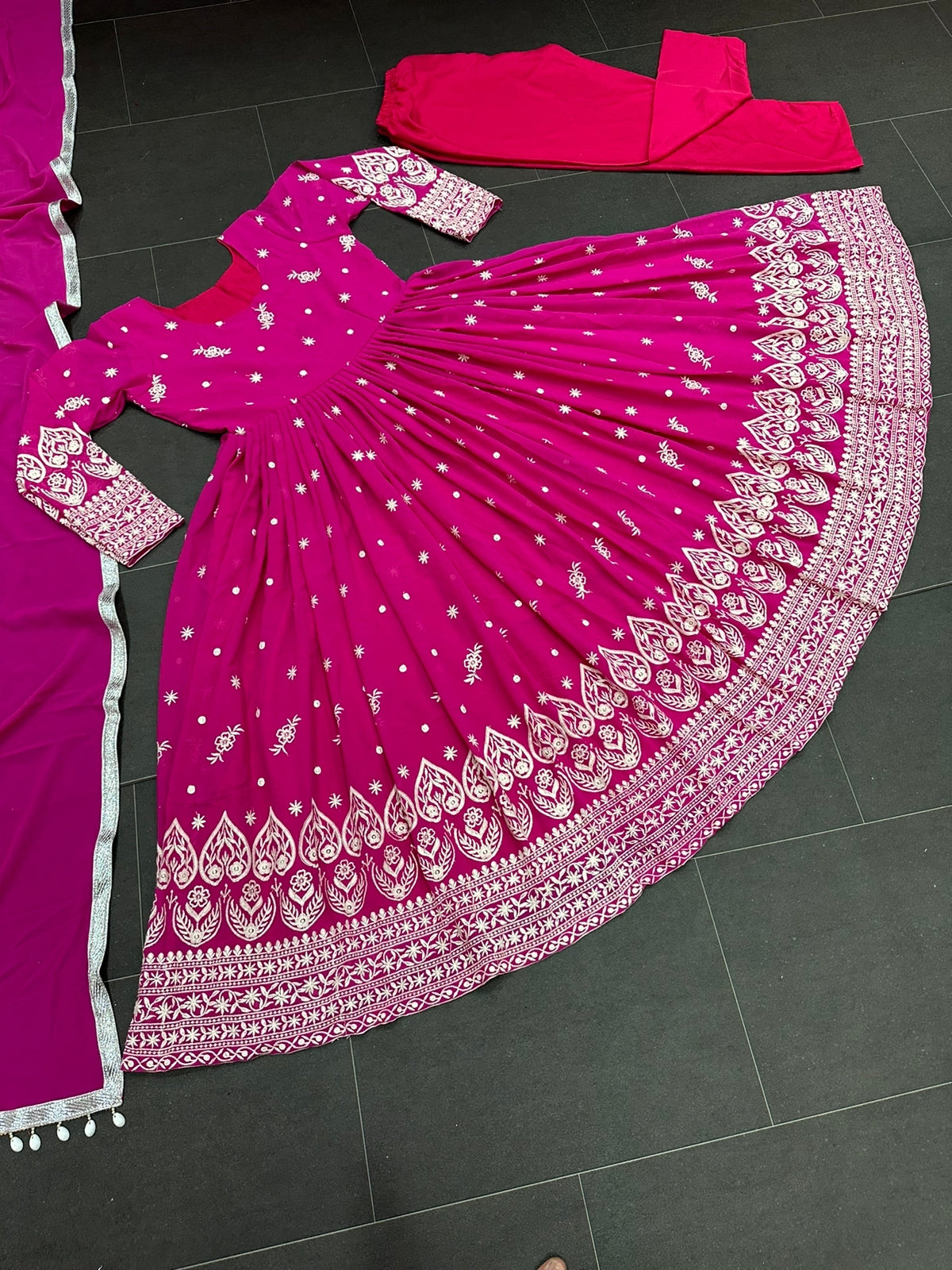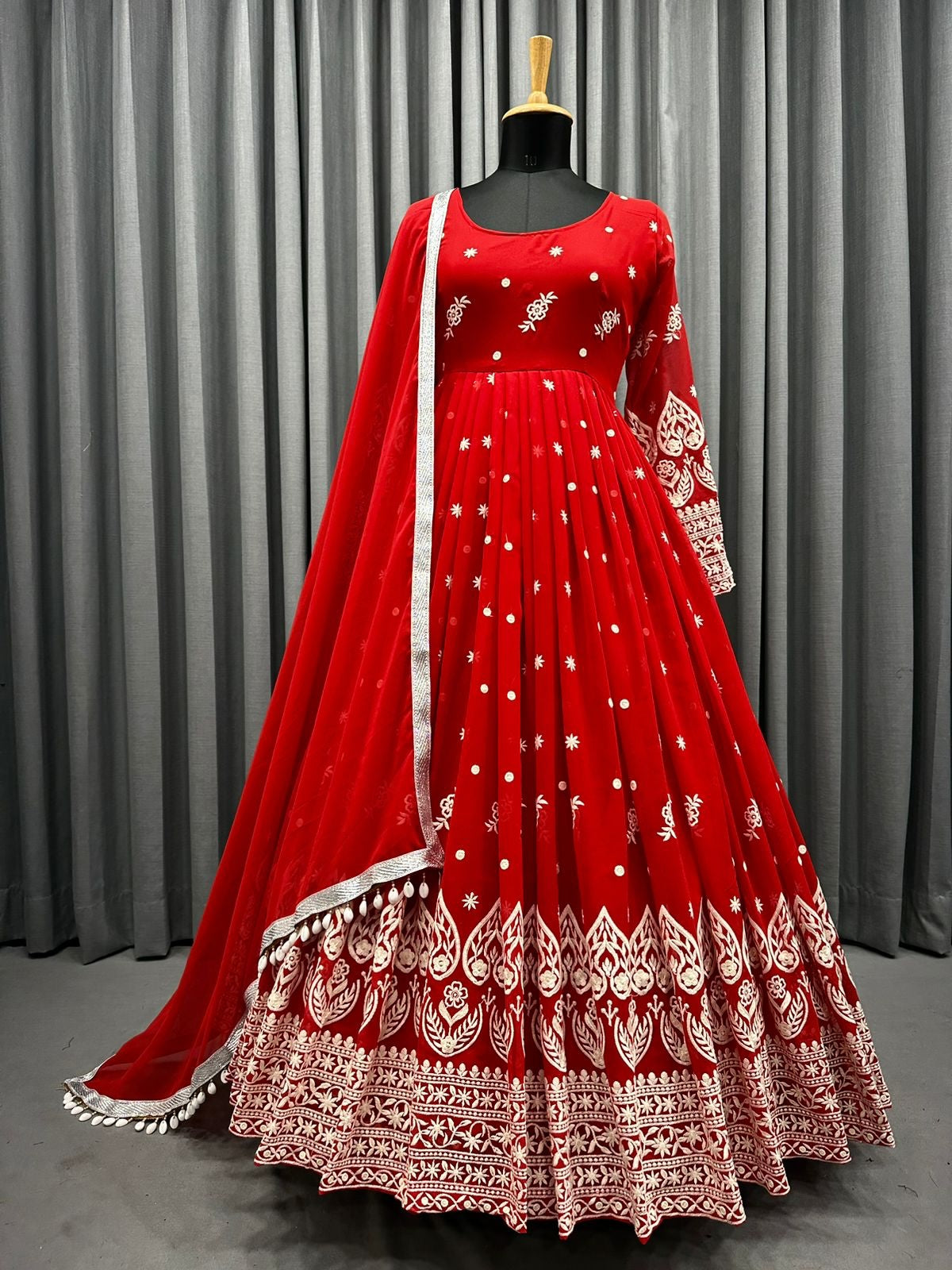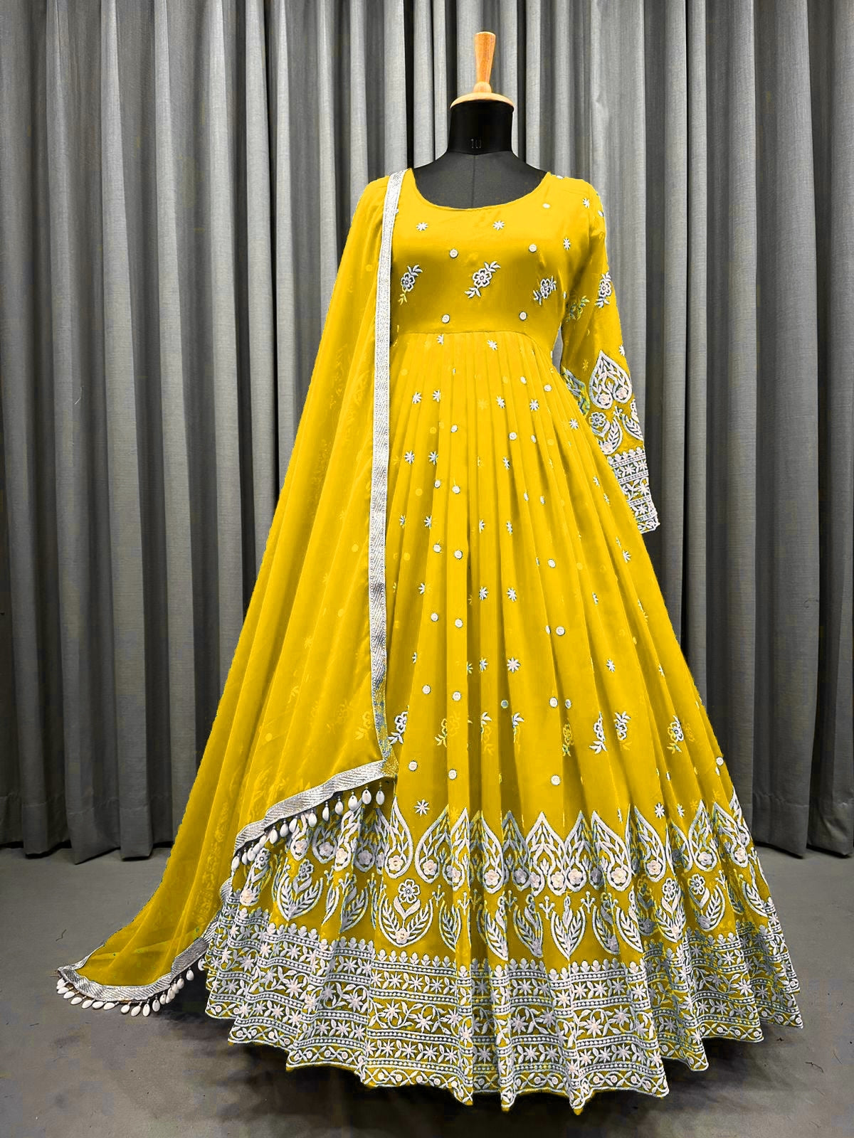 | Gown | Stylish faux georgette embroidered designer suit Attractive Party Wear Maslin Top Bottom has a Regular-fit and is Made From High-Grade Fabrics And Yarn. |