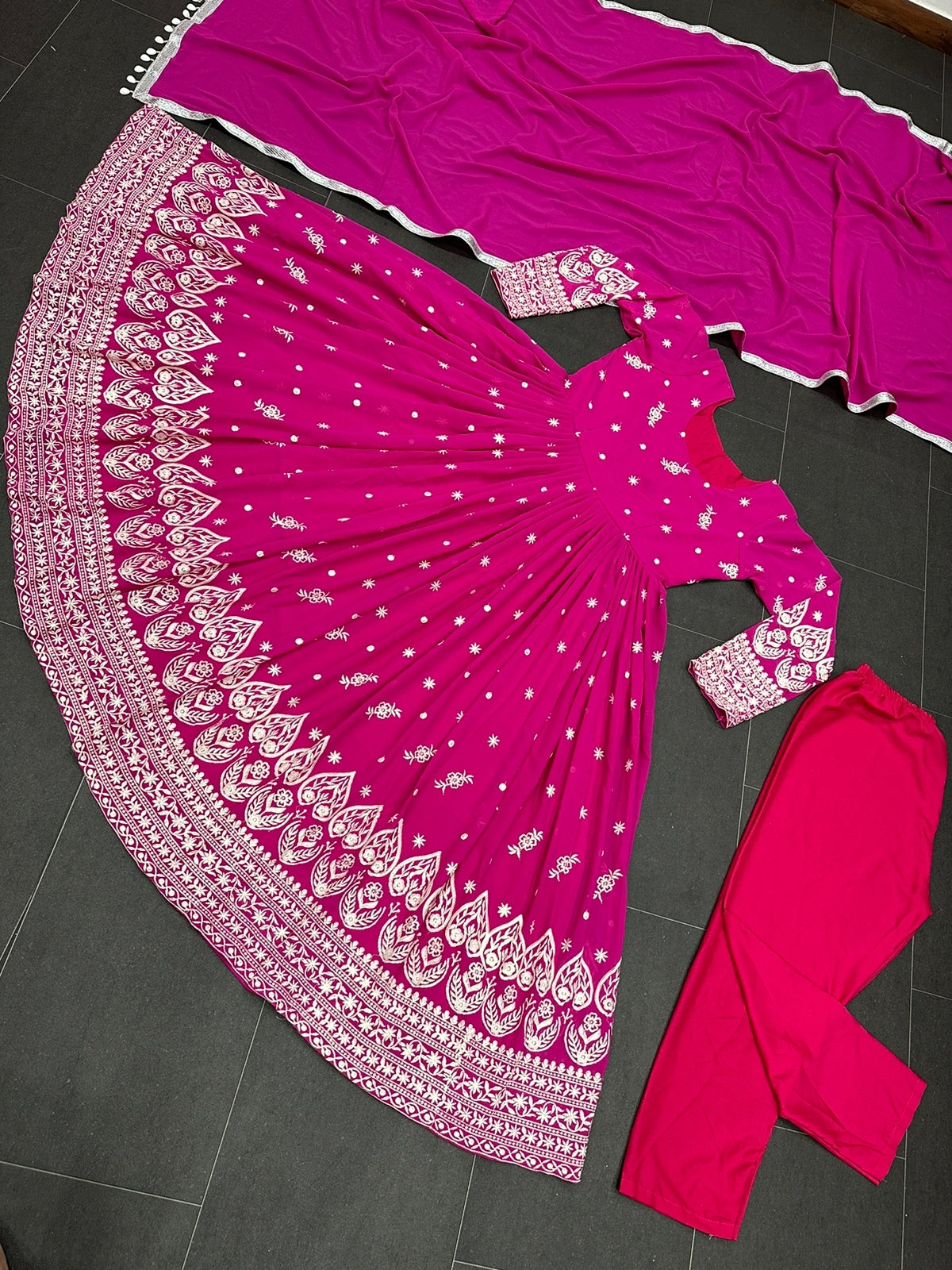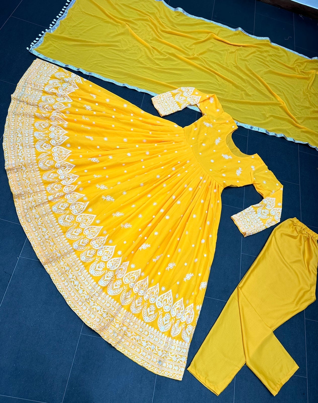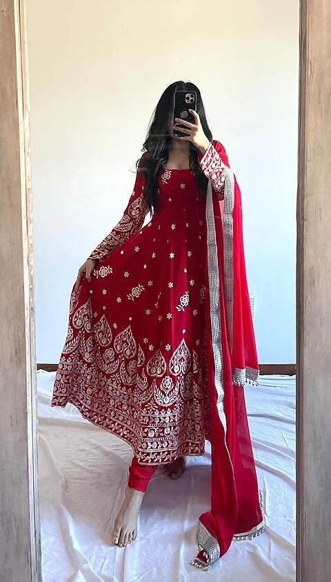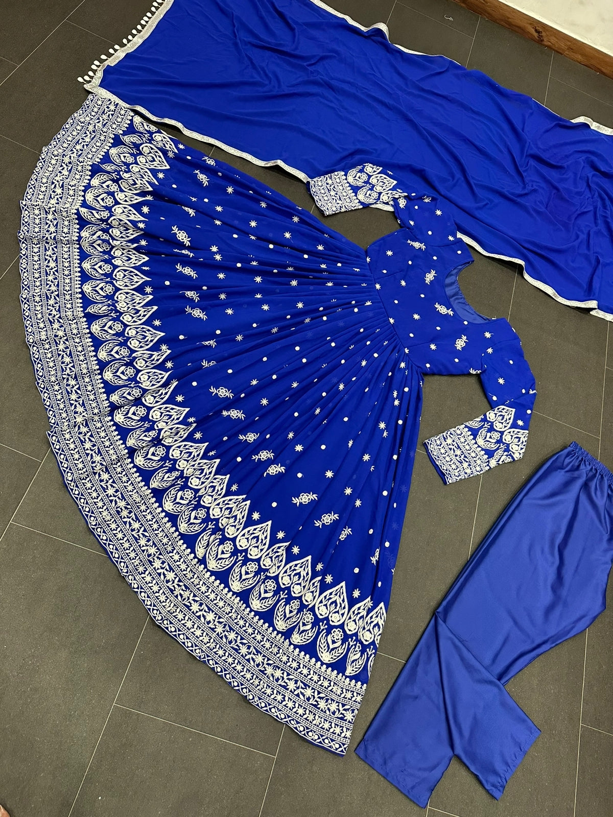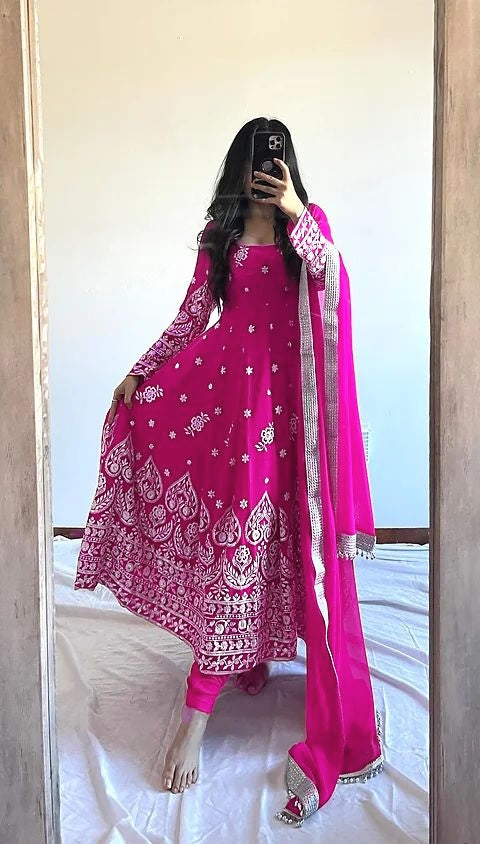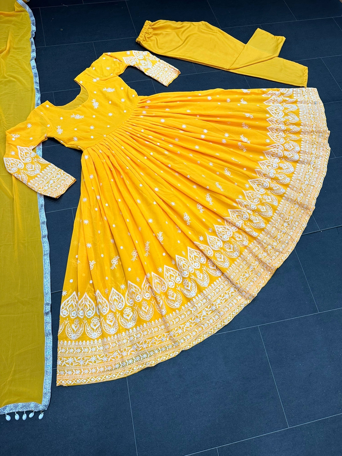 | Gown | Stylish faux georgette embroidered designer suit Attractive Party Wear Maslin Top Bottom has a Regular-fit and is Made From High-Grade Fabrics And Yarn. |