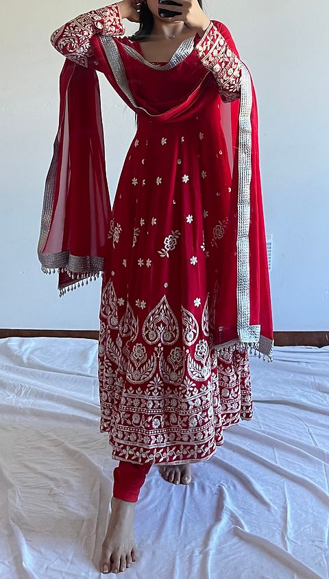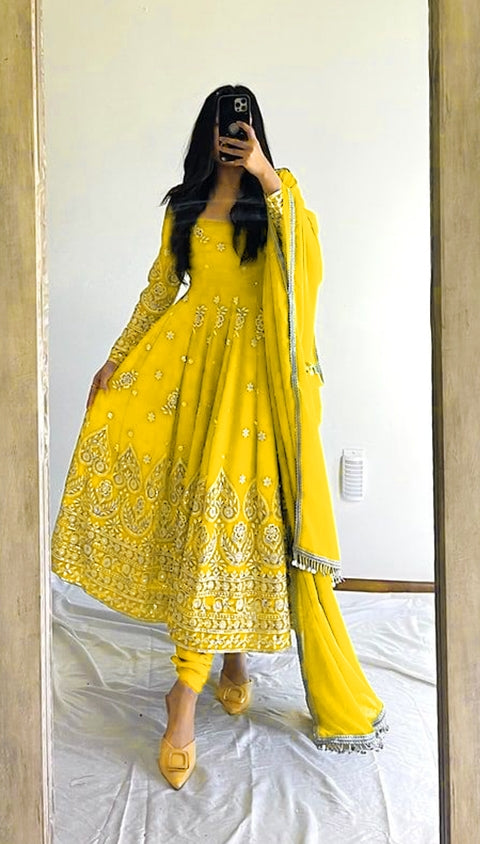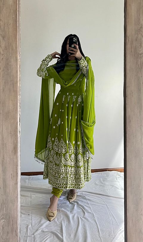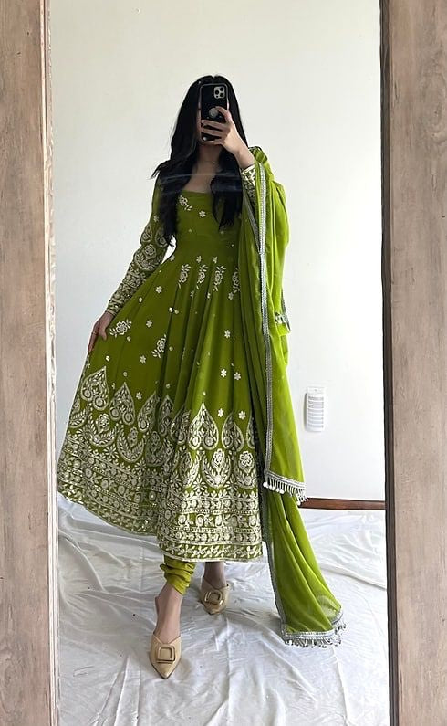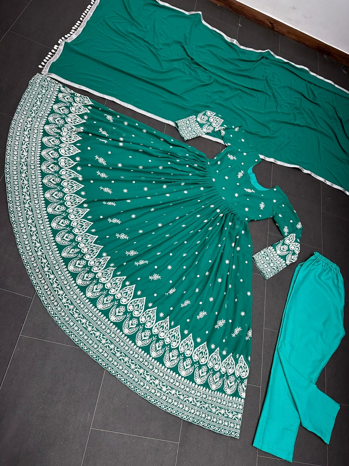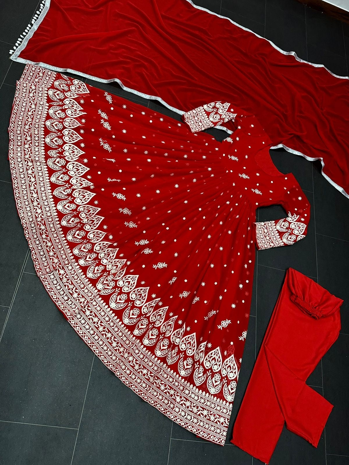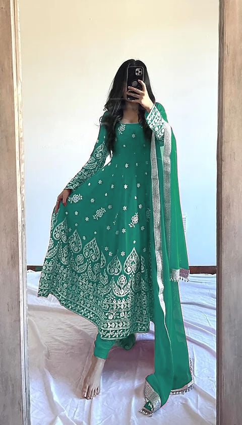 | Gown | Stylish faux georgette embroidered designer suit Attractive Party Wear Maslin Top Bottom has a Regular-fit and is Made From High-Grade Fabrics And Yarn. |