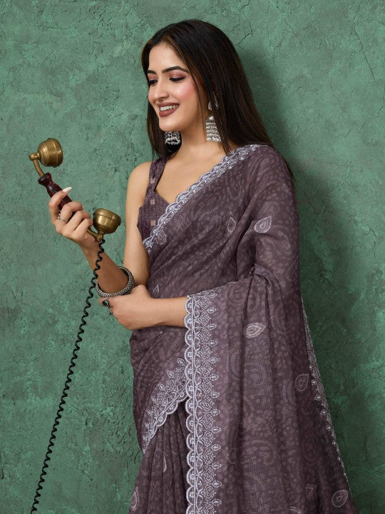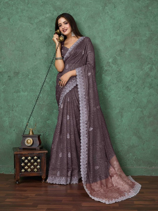 Embroidered Bollywood Pure Cotton Saree (Brown)
