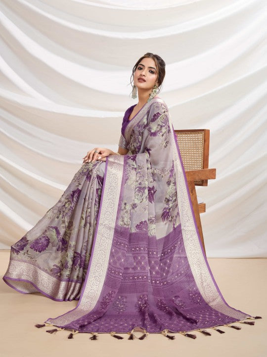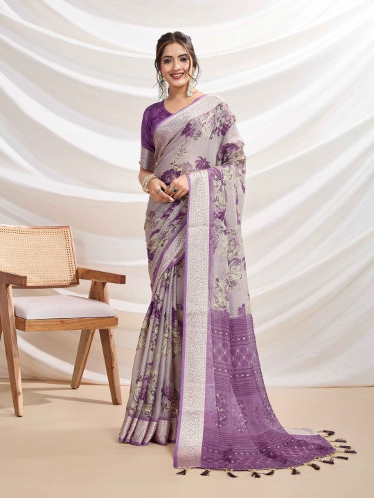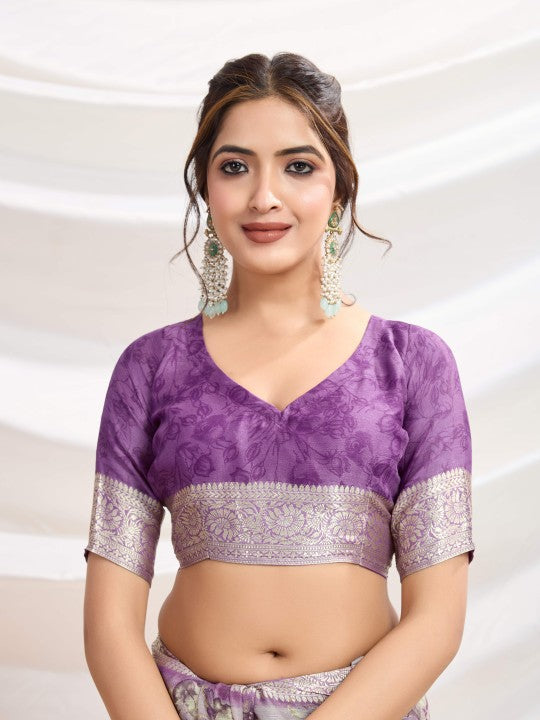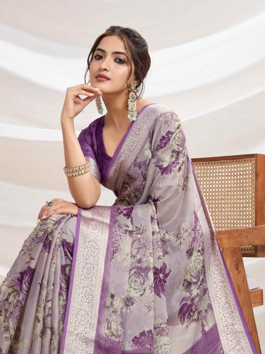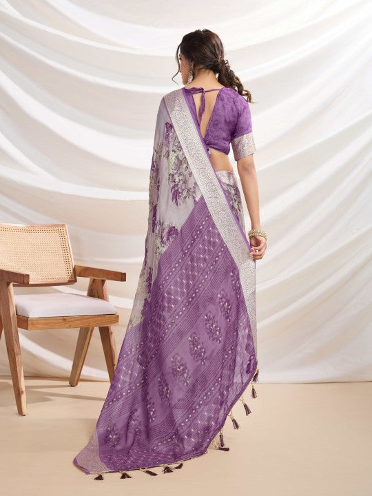 • Floral Print::Printed Bollywood Chiffon Saree (Purple)